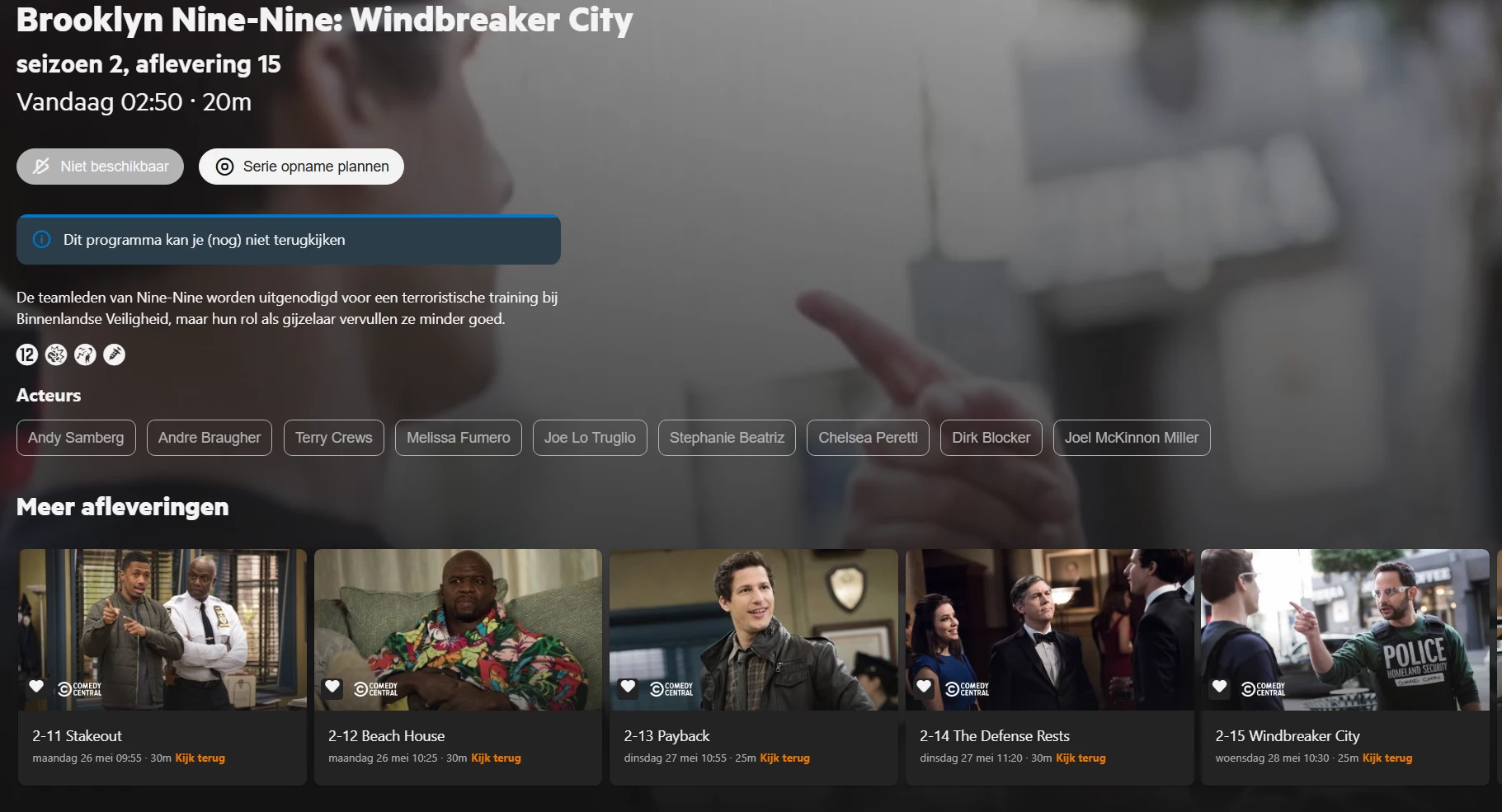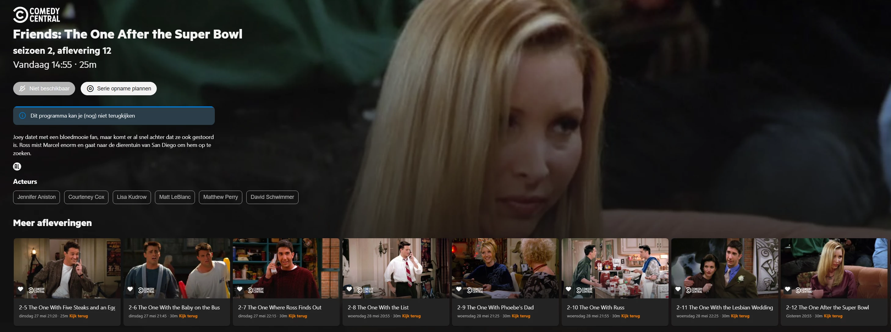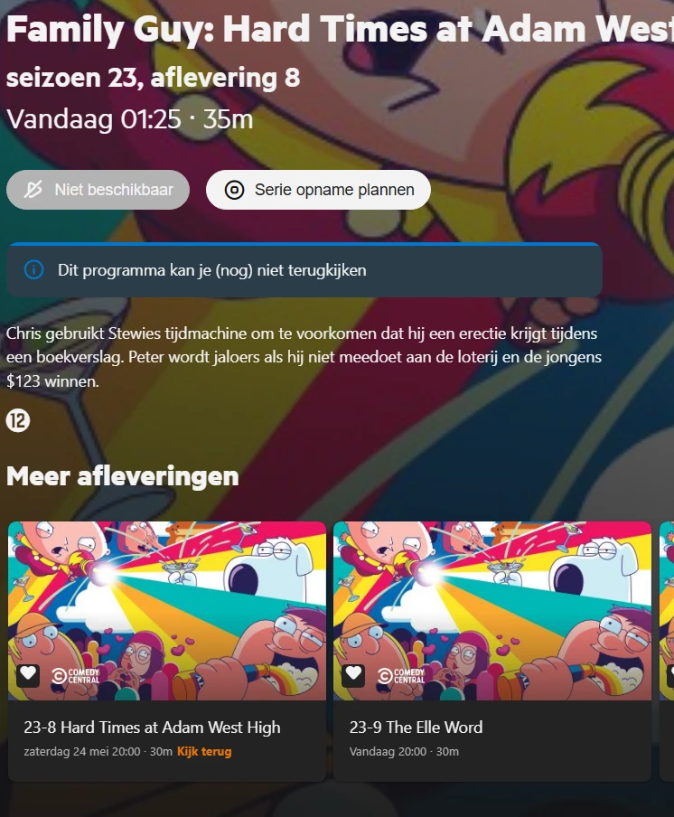 En wat je daar ziet is de aflevering die het verst in de toekomst gepland staat. Omdat 1 niveau hoger ‘Opgenomen’ is geselecteerd (en niet ‘Gepland’) verwacht ik info over een opgenomen aflevering te zien. En misschien nog beter omdat de hele serie is geselecteerd: geen info tonen.