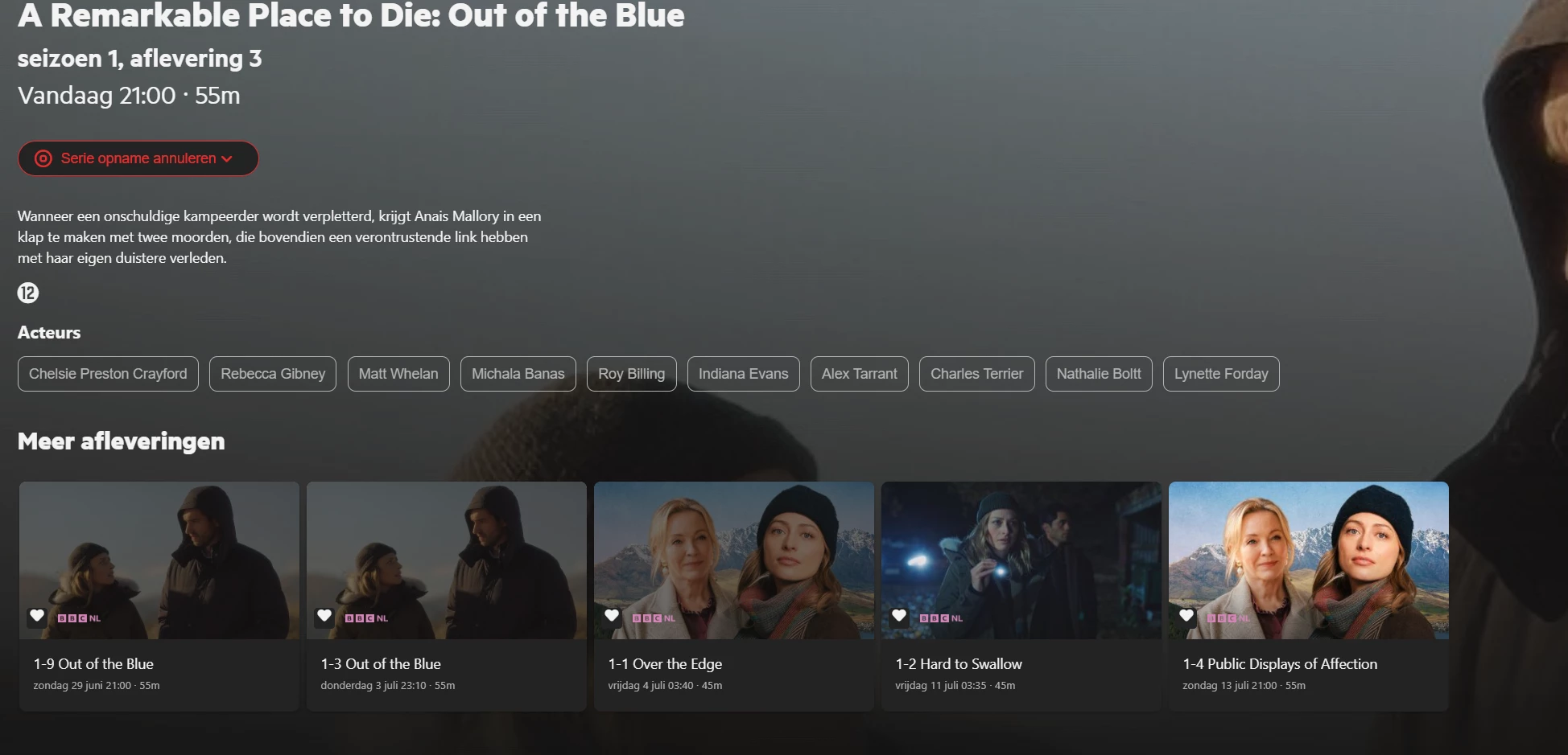 Series, zeker de op BBC NL, zijn inderdaad een uitdaging sinds de nieuwe gids-leverancier. Ik heb 'A Remarkable Place to Die' ook geprogrammeerd maar ik denk dat ik die maar niet ga kijken en hopen dat BBC NL de serie nog eens in de herhaling gooit en dat KPN de gids dan wel op orde heeft.