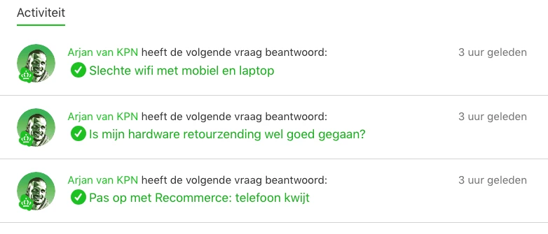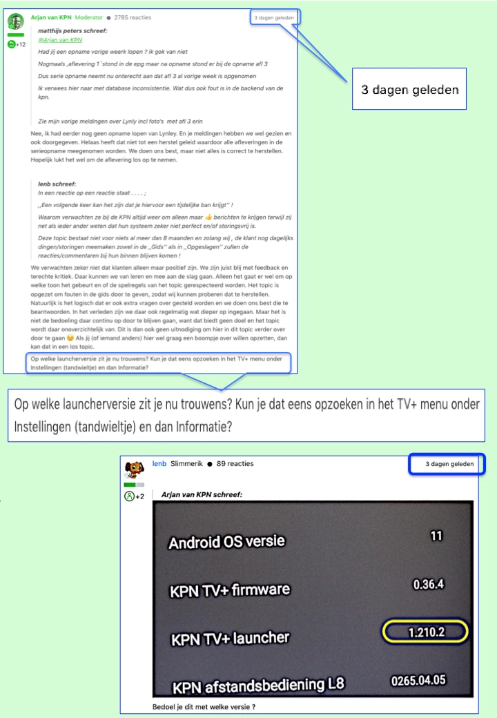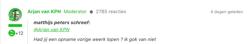 Wat mij bevreemd dat er 3 of > dagen geen reacties meer komen aan de zijde van de KPN , er werd een vraag aan mij gesteld maar daar tot heden nog geen enkele reactie op ontvangen.