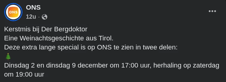 Zoals gisteren door ONS op hun facebook pagina is aangekondigd, is er vandaag en volgende week dinsdag 9 december een kerstspecial van Der Bergdoktor in 2 delen, om 17:00 uur. In de EPG staat voor zowel vandaag als 9 december seizoen 2 aflevering 9, maar geen deel 1 en 2. Datzelfde geldt dan voor de herhaling op zaterdag om 19:00 uur.