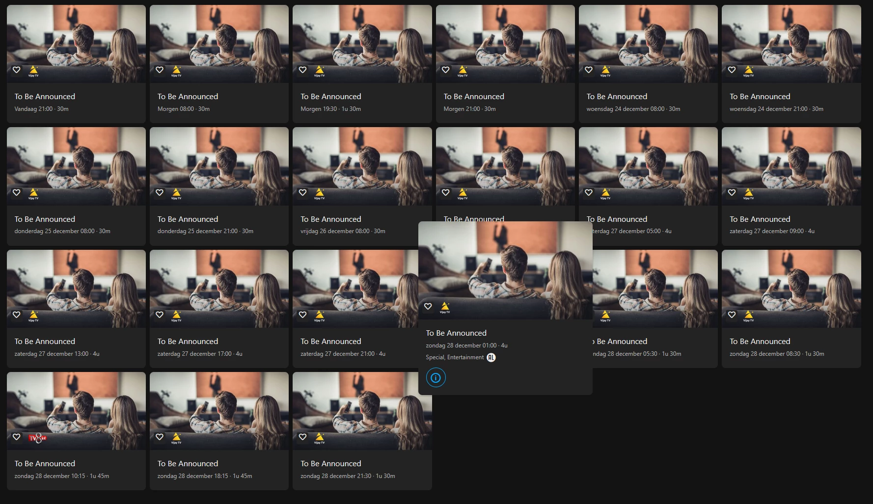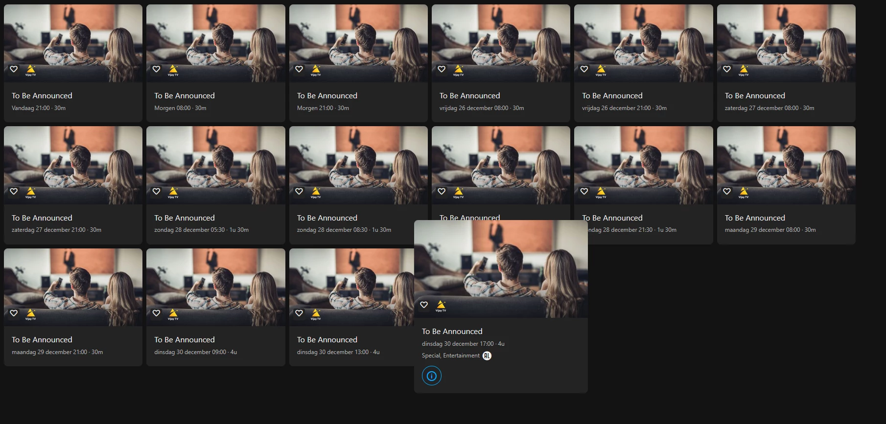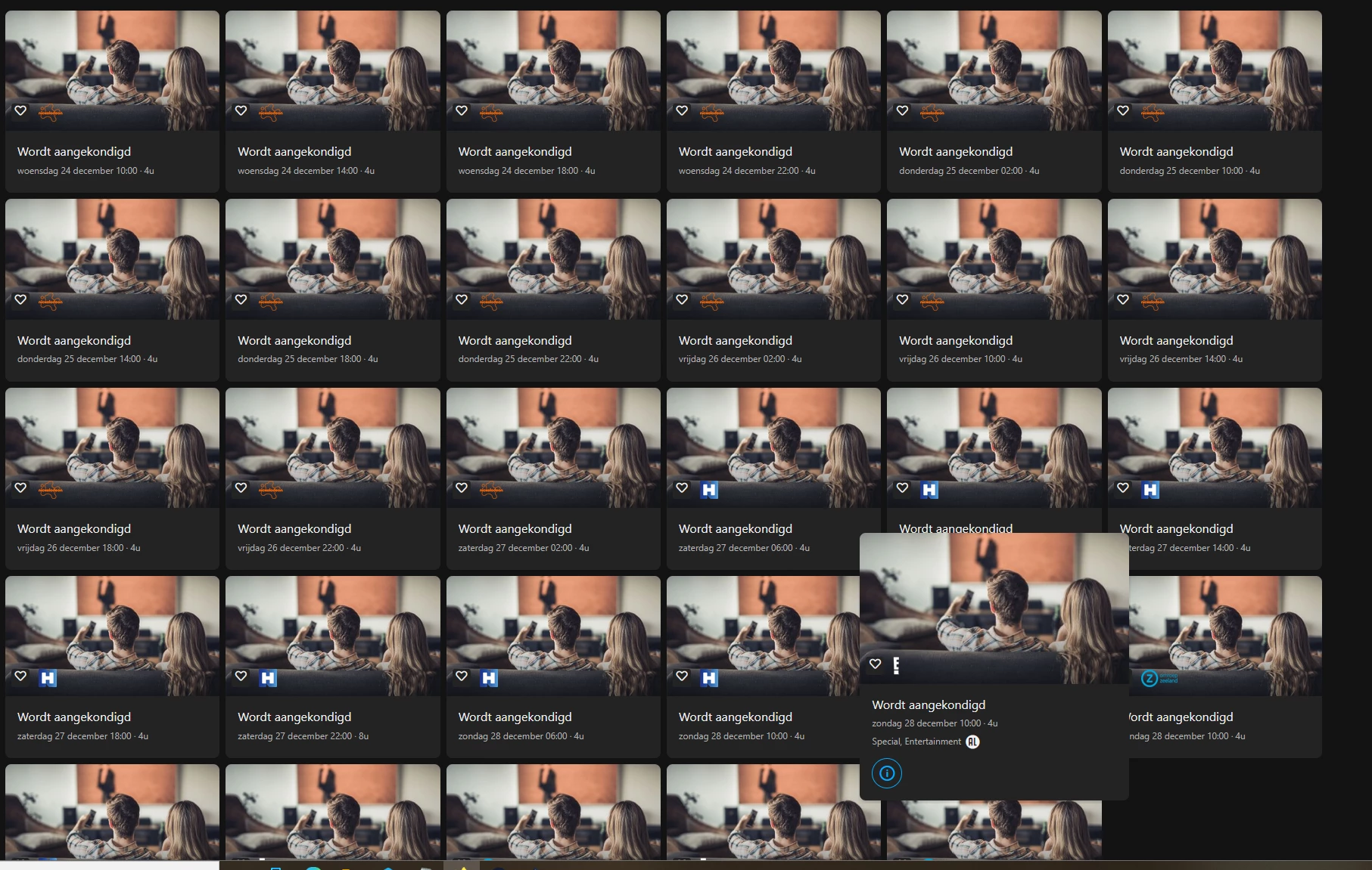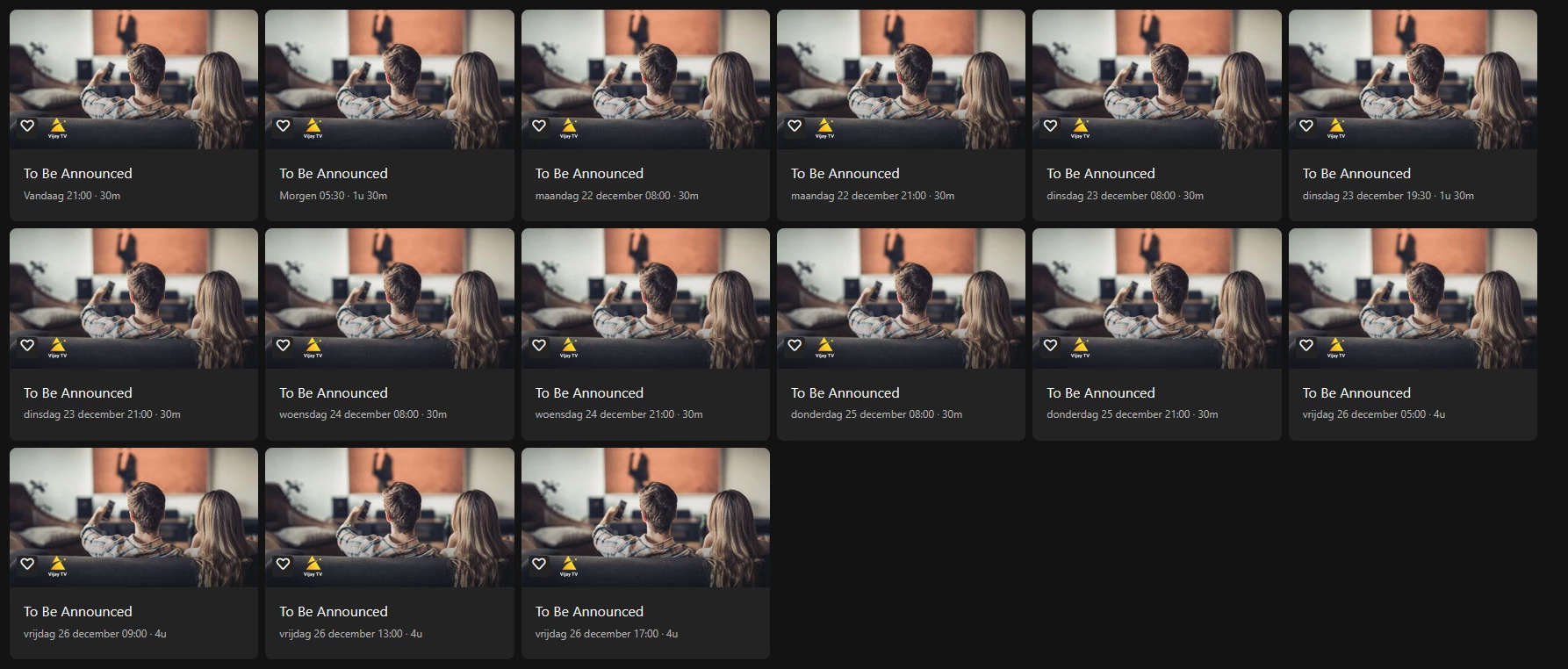 Ook vanuit deze hoek wil ik jullie onwijs bedanken voor alle input (gegeven en nog te komen). Zoals jullie gemerkt hebben is het verwerken van deze bergen gidsgegevens een enorme klus en dat zal ook voor komend jaar een flinke uitdaging blijven. Juist die details (gebruikte foto’s, seizoen/afleveringsnummers, duratie van programma’s en ga zo maar door) die door jullie aangedragen zijn hebben absoluut bijgedragen aan de nodige verbeteringen en/of herstel. Precies die zaken die door de systemen niet afgevangen kunnen worden, maar waar kennis voor nodig is van dat wat er uitgezonden wordt. Hetzij kennis van een specifiek programma en/of onlogische indeling om maar een voorbeeld te noemen. Dankbaar voor de hulp in dit afgelopen jaar en we hopen dat we dit in 2026 voort mogen zetten.