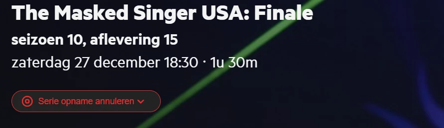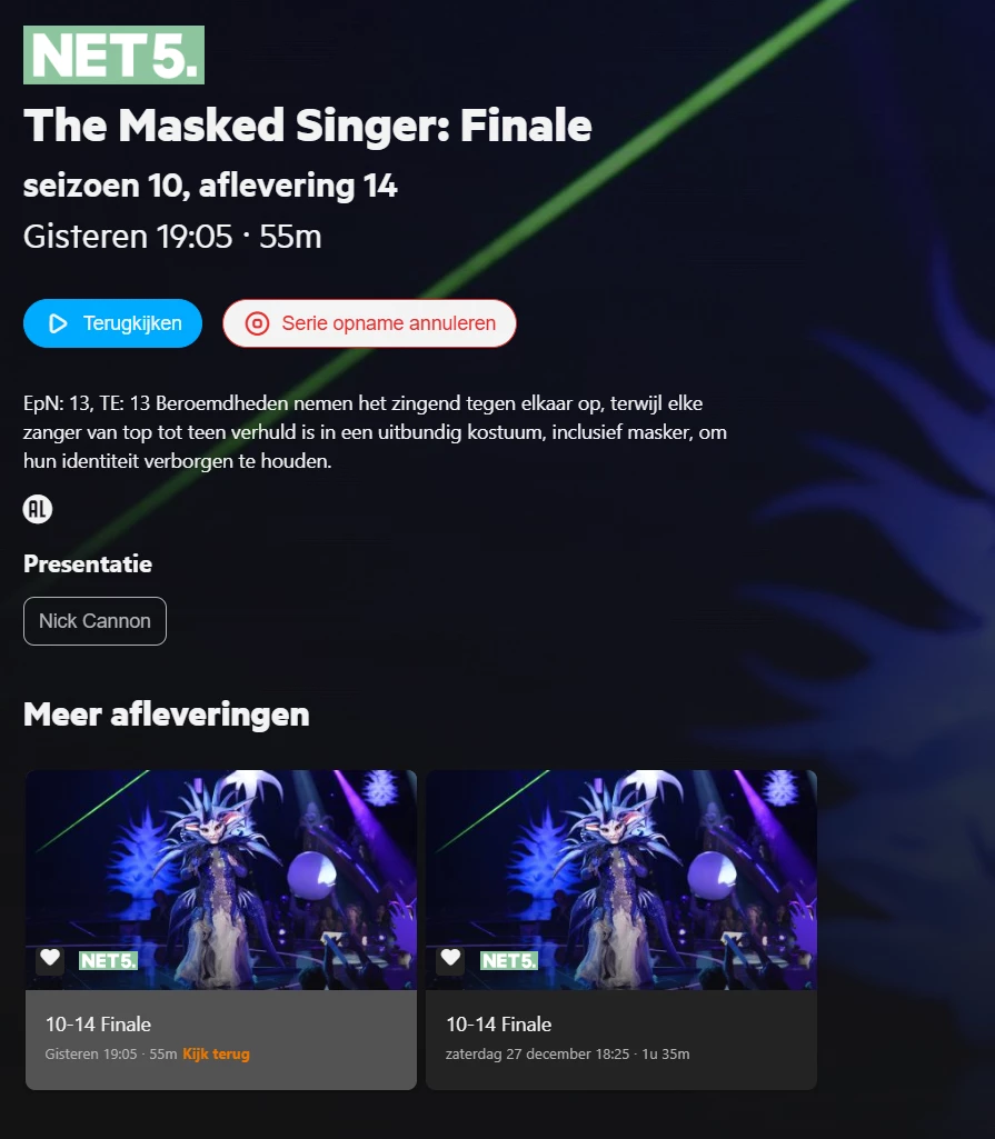 Verder is de aflevering van de Masked Singer aangepast en zou nu als aflevering 15 in de serieopname mee moeten gaan, kun je checken of dit bij jou inderdaad ook zo is, ​@matthijs peters ?