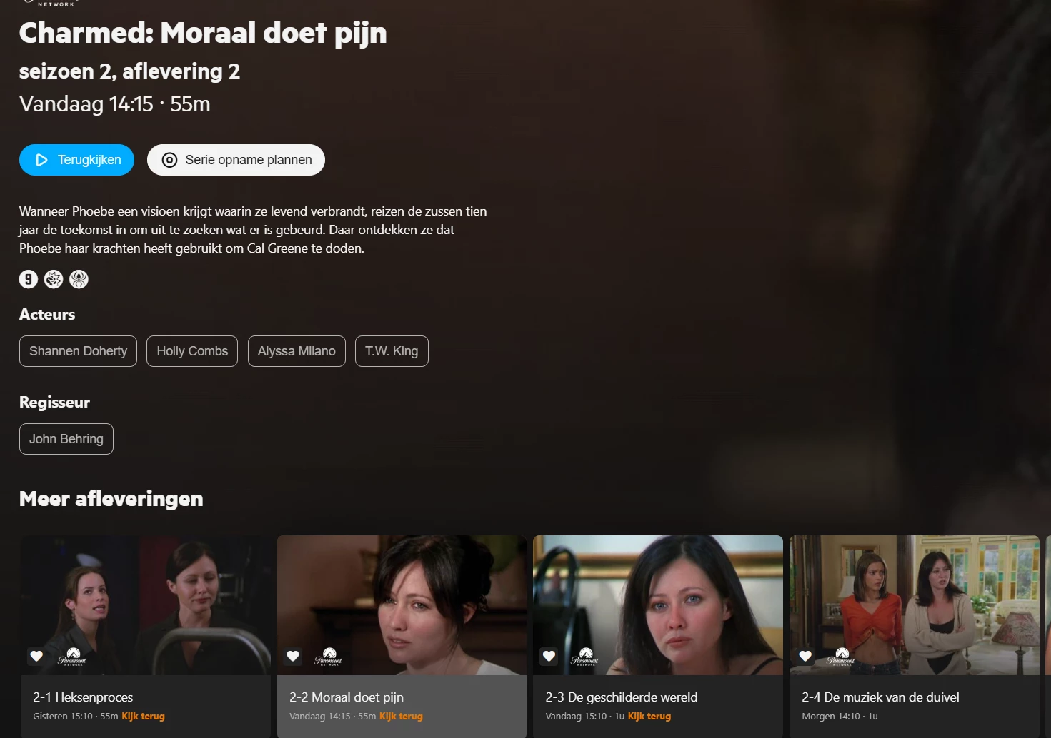 Op Paramount Network bij de serie Charmed is een aflevering overgeslagen in de programmering. De aflevering die is overgeslagen is seizoen 2, aflevering 2, dus de serie gaat van aflevering 1 uit seizoen 2 naar aflevering 3 uit seizoen 2. De beschrijving van aflevering 2 staat nu bij aflevering 3 (uitgezonden op 20-01-2026 om 14:15). Alle beschrijvingen zijn nu een aflevering opgeschoven, waardoor de beschrijving een aflevering achterloopt op wat er uitgezonden wordt.