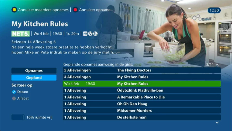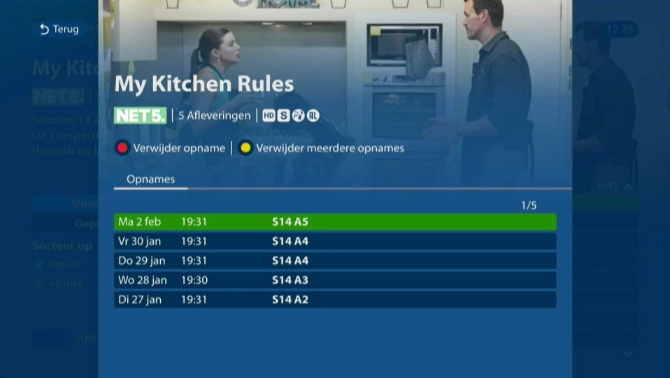 1. my kitchen rules, net 5. Waarschijnlijk veroorzaakt door net5 maar niet waargenomen en voorkomen door epg leverancier en kpn