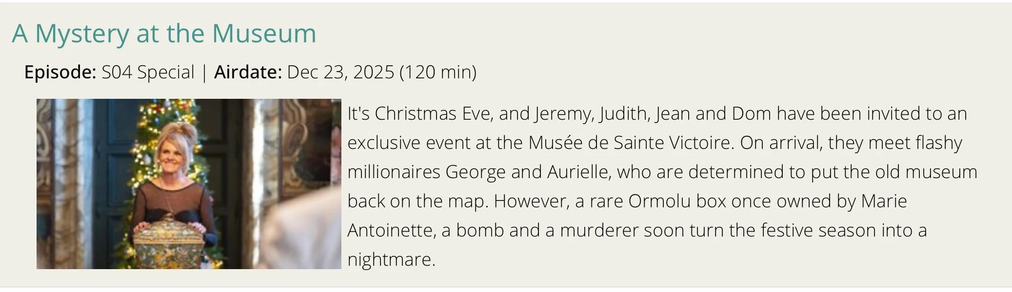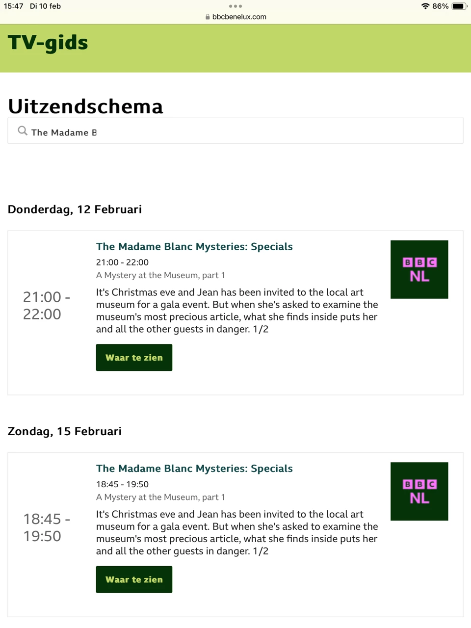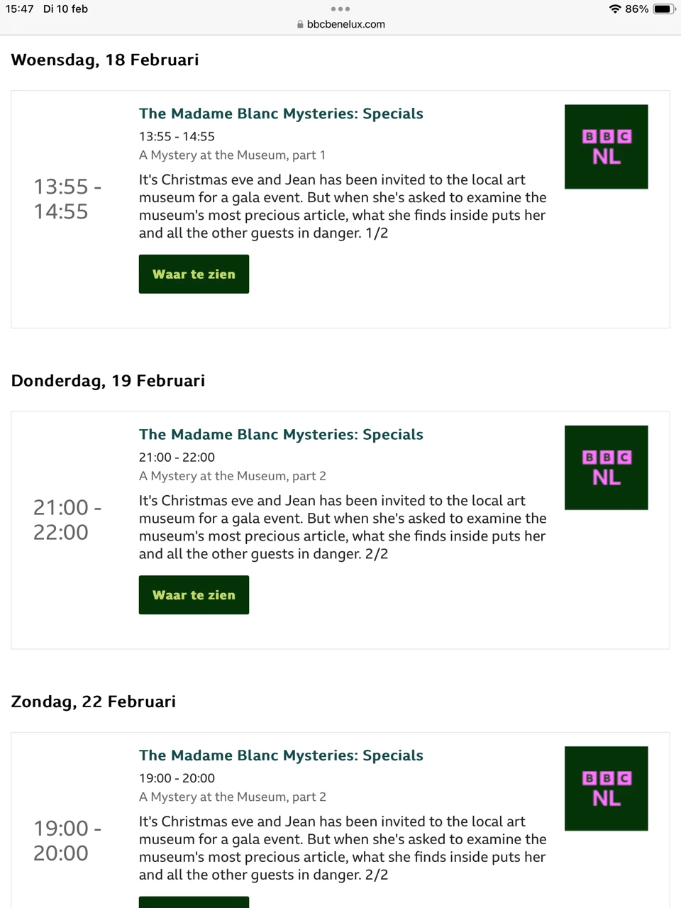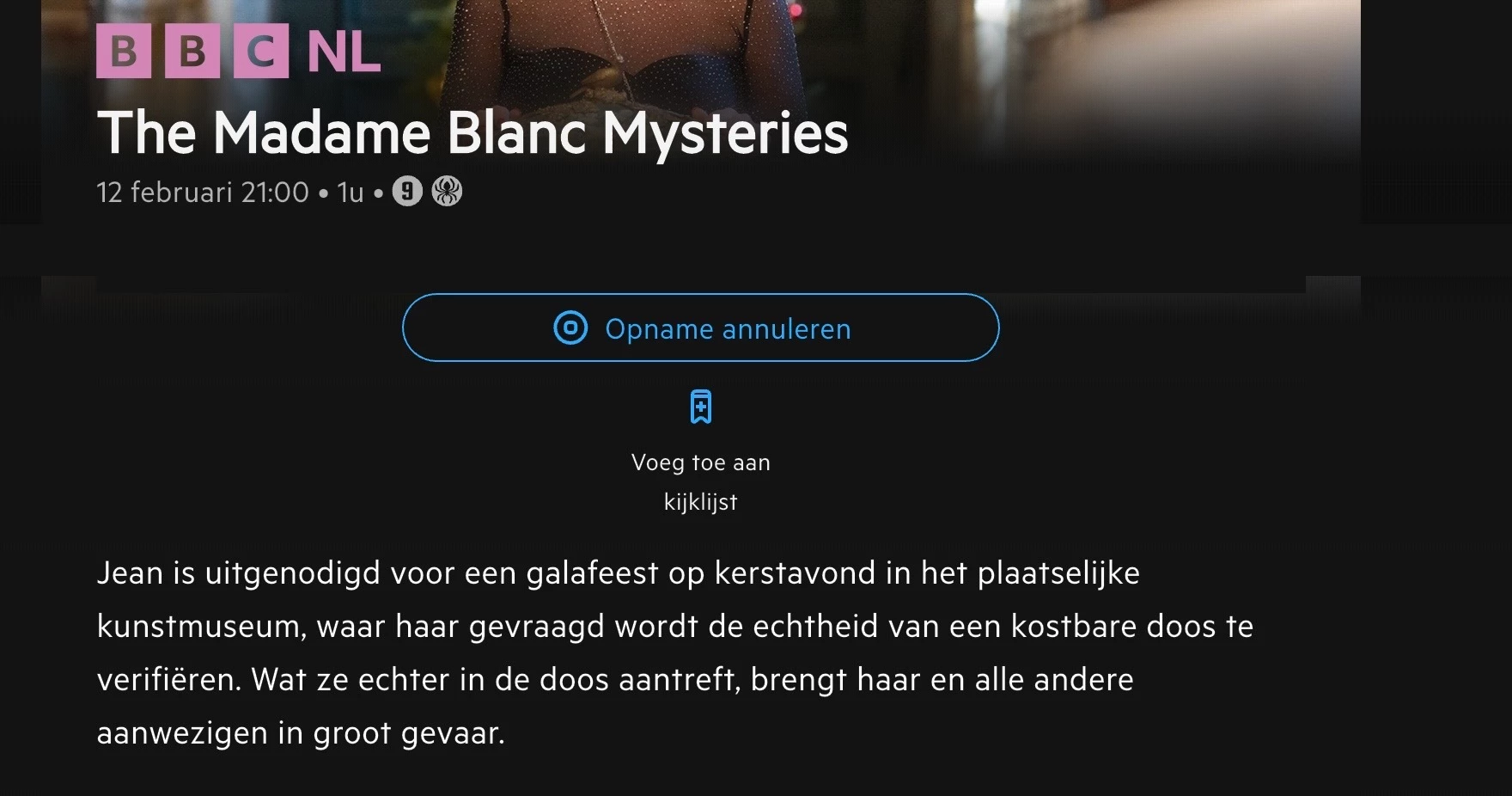 Is het nou een gesplitste aflevering van The Madame Blanc Mysteriesof of niet? Dat is nog niet helemaal duidelijk inderdaad ​@Hermanqwerty. Eerder hebben we er naar gekeken en leek de juiste data aangeleverd te worden vanuit de gidsleverancier, maar we gaan er opnieuw mee bezig. Zo'n kerstspecial valt verder niet onder een seizoen, dus als een serieopname mogelijk is, dan is dat alleen voor de losse delen van deze aflevering.