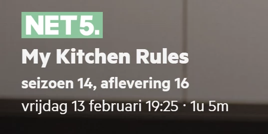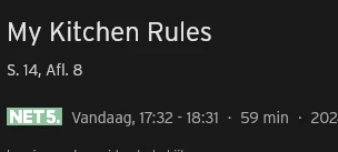 Ik heb nog een opmerking met betrekking tot my kitchen rules op net5. Volgens de zender zelf en tv gids.nl worden de afleveringen vanaf morgen om 17:30 uitgezonden i.p.v. 19:30 wat nog bij kpn in de gids staat.