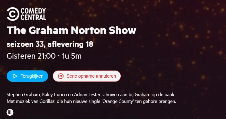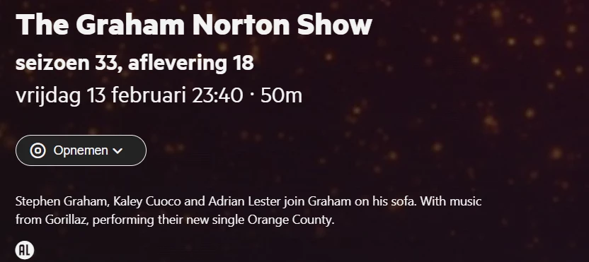en datr moet dus zijn “Stephen Graham, Kaley Cuoco en Adrian Lester schuiven aan bij Graham op de bank. Met muziek van Gorillaz, die hun nieuwe single 'Orange County' ten gehore brengen.”