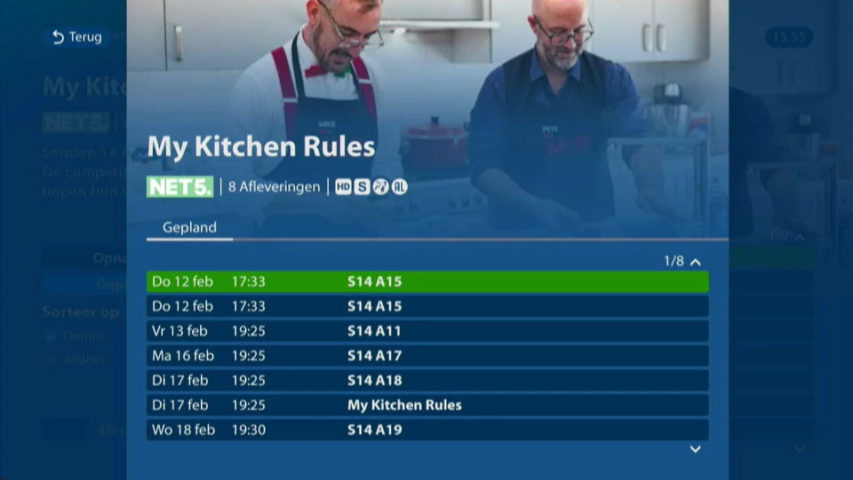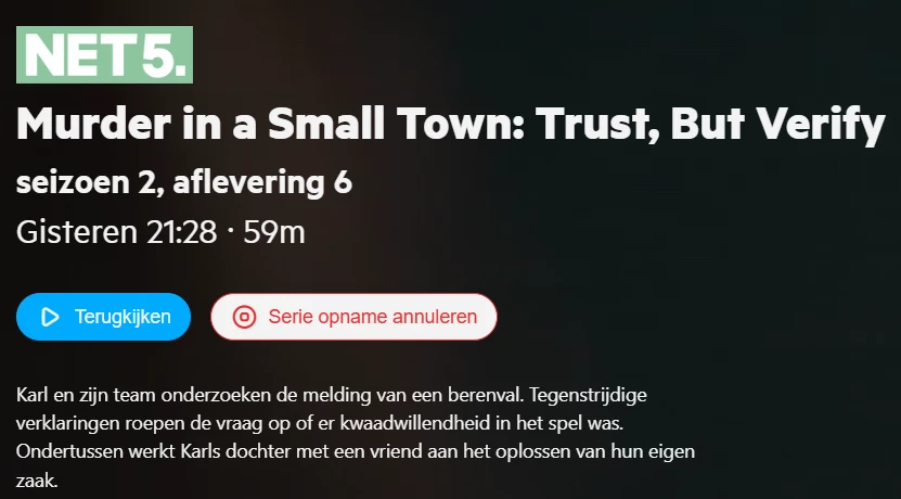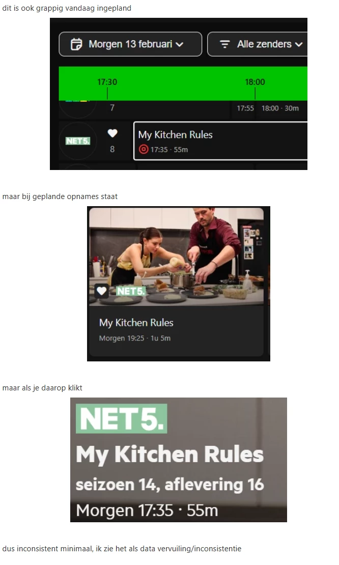 In de serie is deze nu dus terug te vinden (met het alternatieve NET5 nummer). Vrijdag houden we nog even in de gaten, want daar staat nu nog het originele nummer, maar de alternatieve (aflevering 16) hebben we ook staan in de gids. De dubbele registraties in bovenstaande afbeelding zijn 1 gelukte / 1 mislukte planning en trekt recht wanneer ze opgenomen zijn.