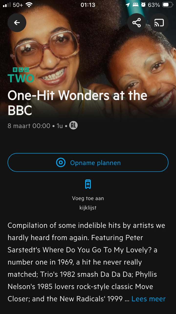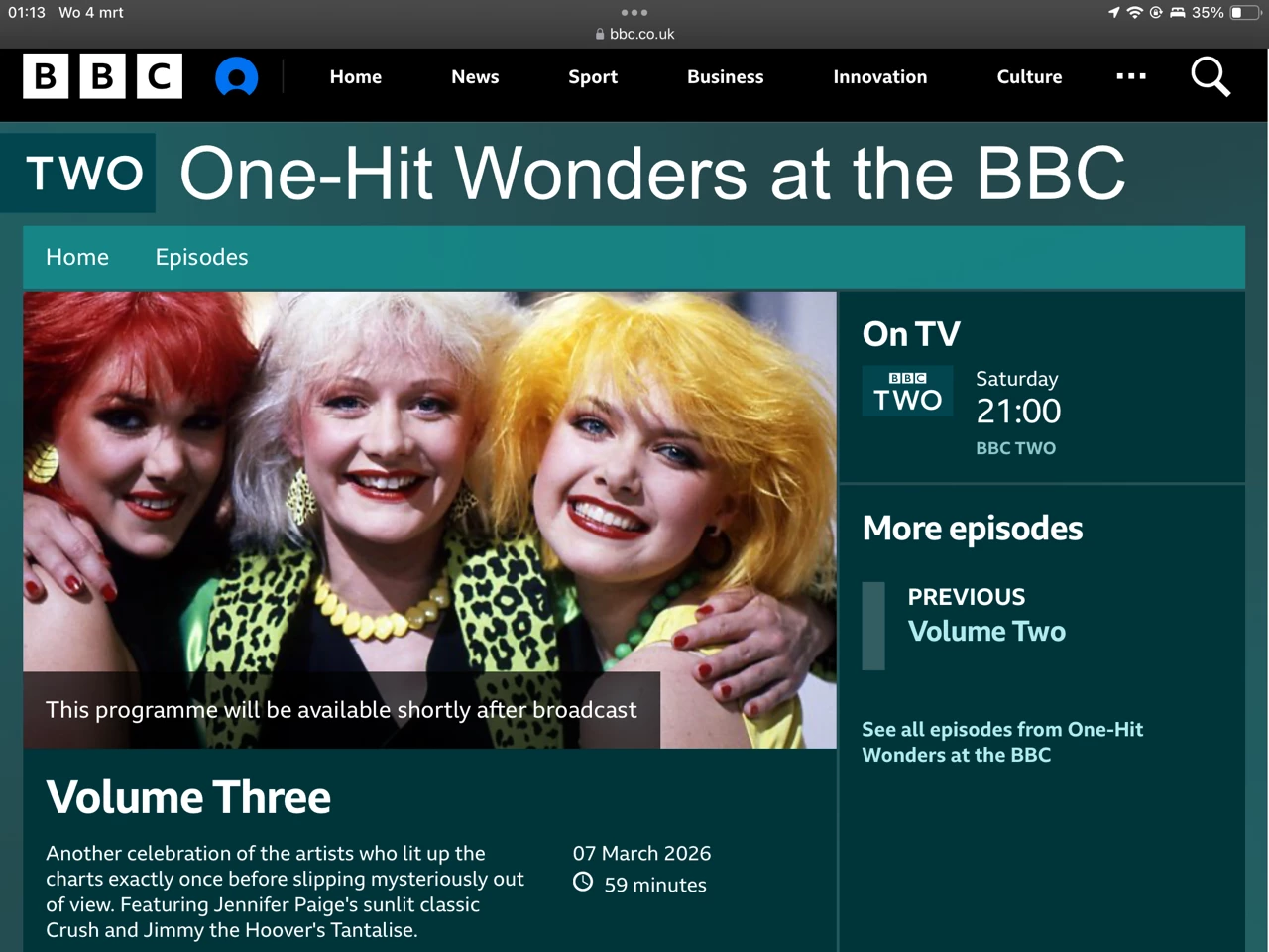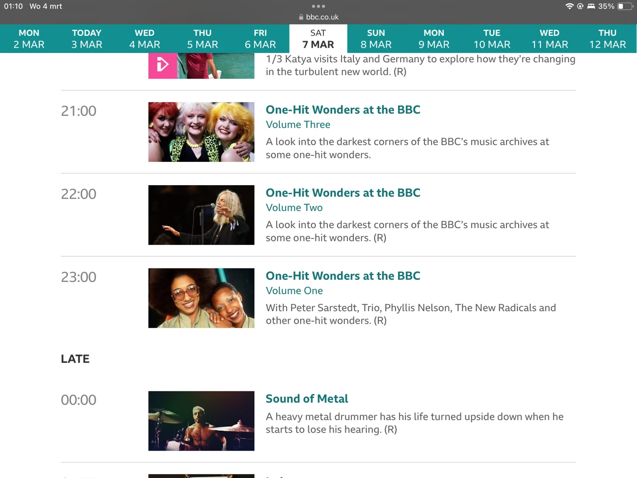 BBC Two, za 7 maart 22:00 One-Hit Wonders at the BBC, heeft in de epg dezelfde beschrijving (en titel) als de afl. om (8 maart) 0:00.