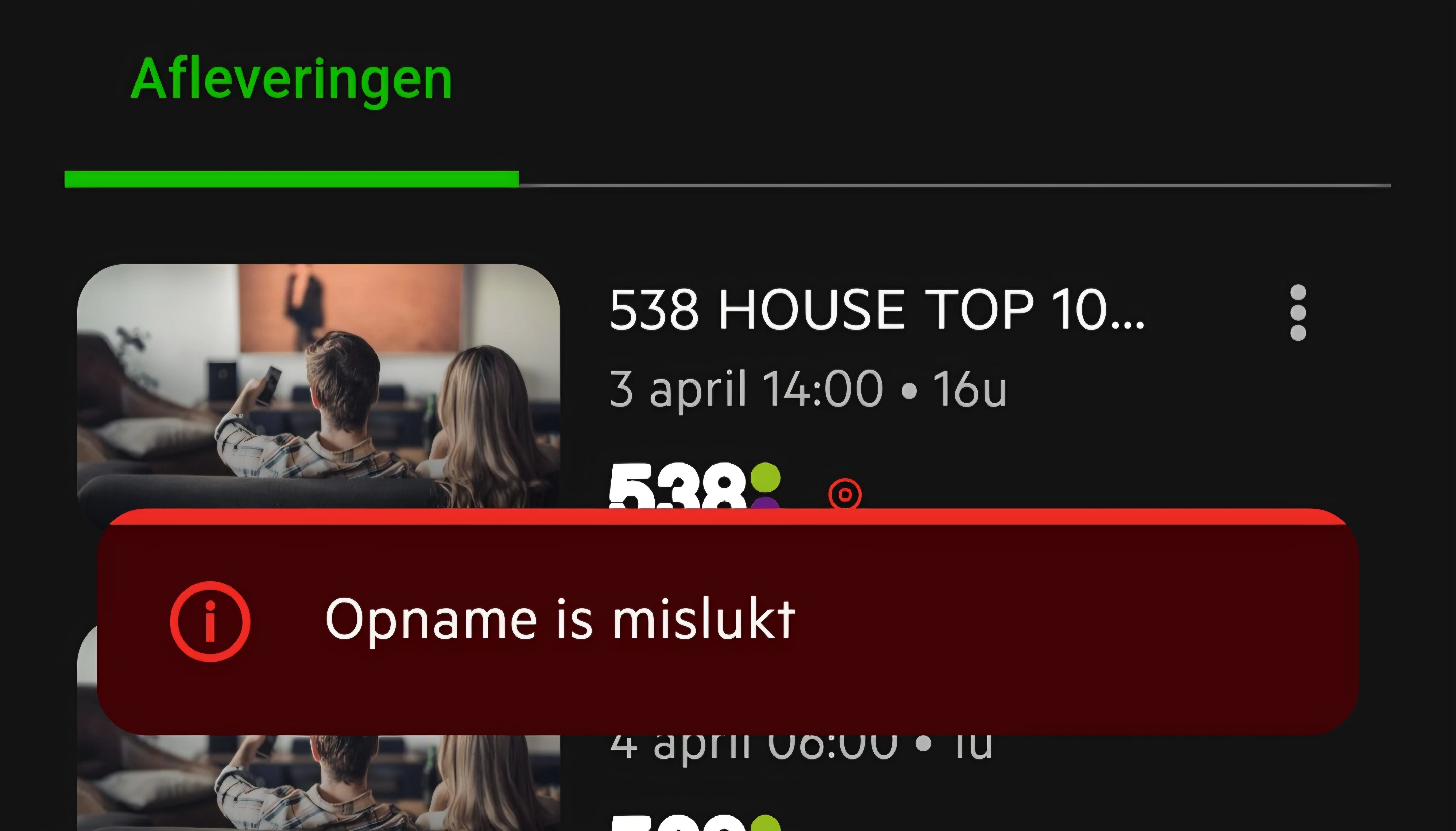 En excuses dat sommige opnames van de 538 House Top 1000 marathon zijn mislukt ​@Sebas14. Waarschijnlijk zijn er gedurende het weekend nog allerlei updates geweest van de gids en heeft dit voor corrupte opnames gezorgd. We konden de gids op vrijdag helaas niet meer op tijd herstellen.