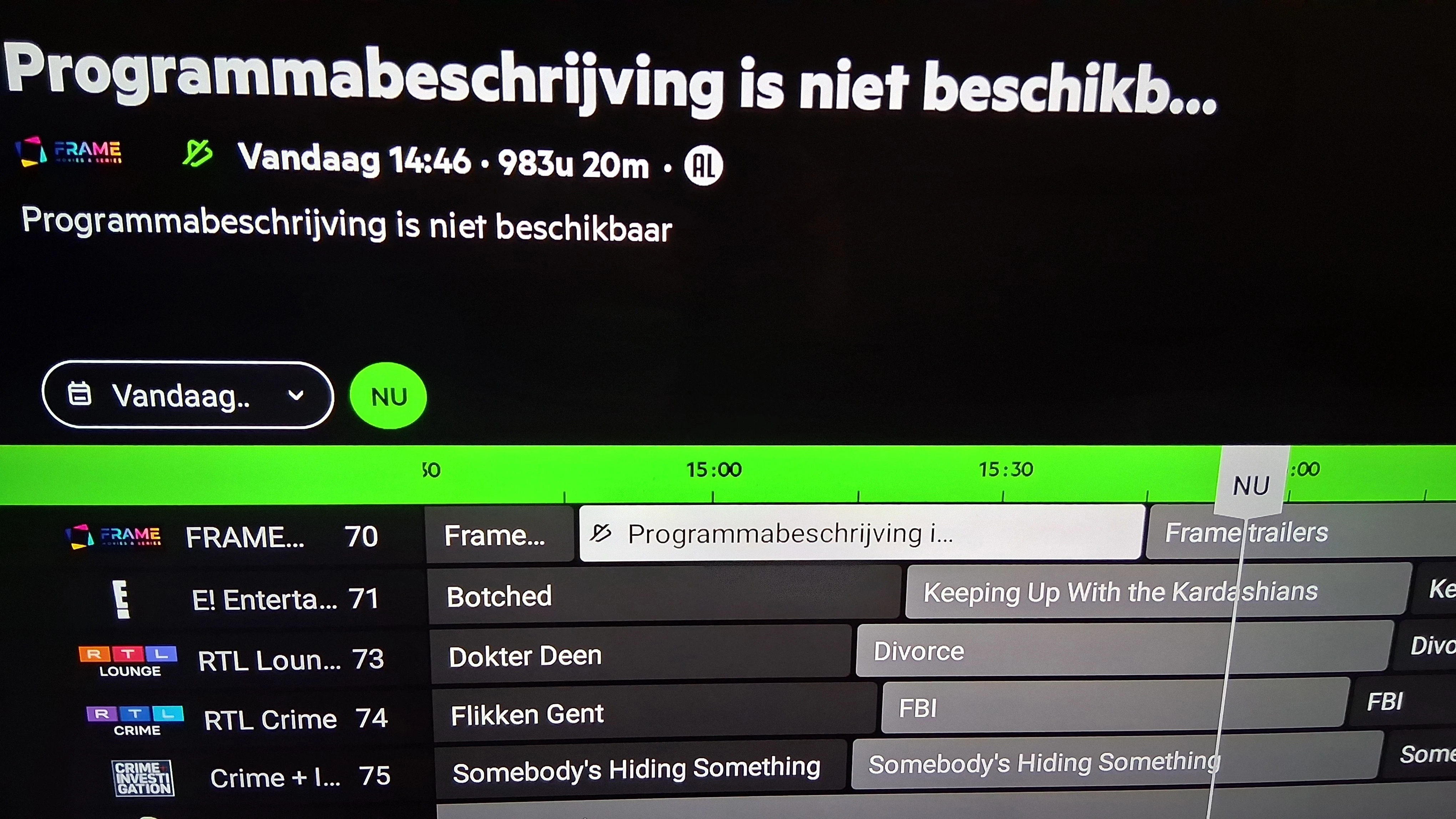 De nieuwe zenders die vandaag zijn toegevoegd bevatten ook al fouten. Dit voorbeeld is wel van eerder vandaag. Op Frame movies en series (kanaal 70) stond om 14:46 uur The Killings in de EPG, dat had ik ingepland, maar dat is nu verdwenen in de EPG en is dan ook niet opgenomen. Gelukkig wordt dit wel herhaald en heeft automatisch de herhaling ingepland voor opname. Nu staat er bij 14:46 uur Programmabeschrijving is niet beschikb… , in plaats van beschikbaar,  wat maar liefst 983 uur duurt. Dit is wel via de DIW7022. Als ik bij tv.kpn.com kijk in de tv gids dan duurt de film eerder bijna 4 uur. Dus daar zit dan nog wel verschil in.
