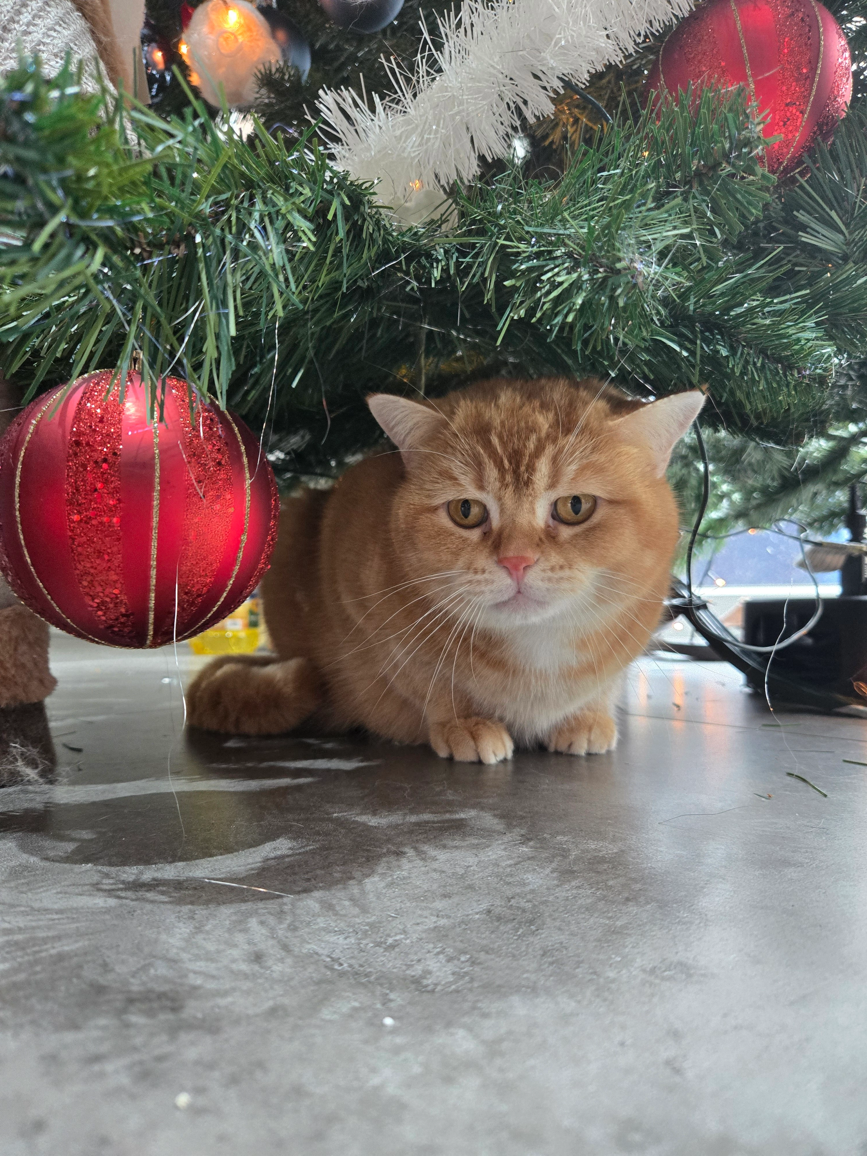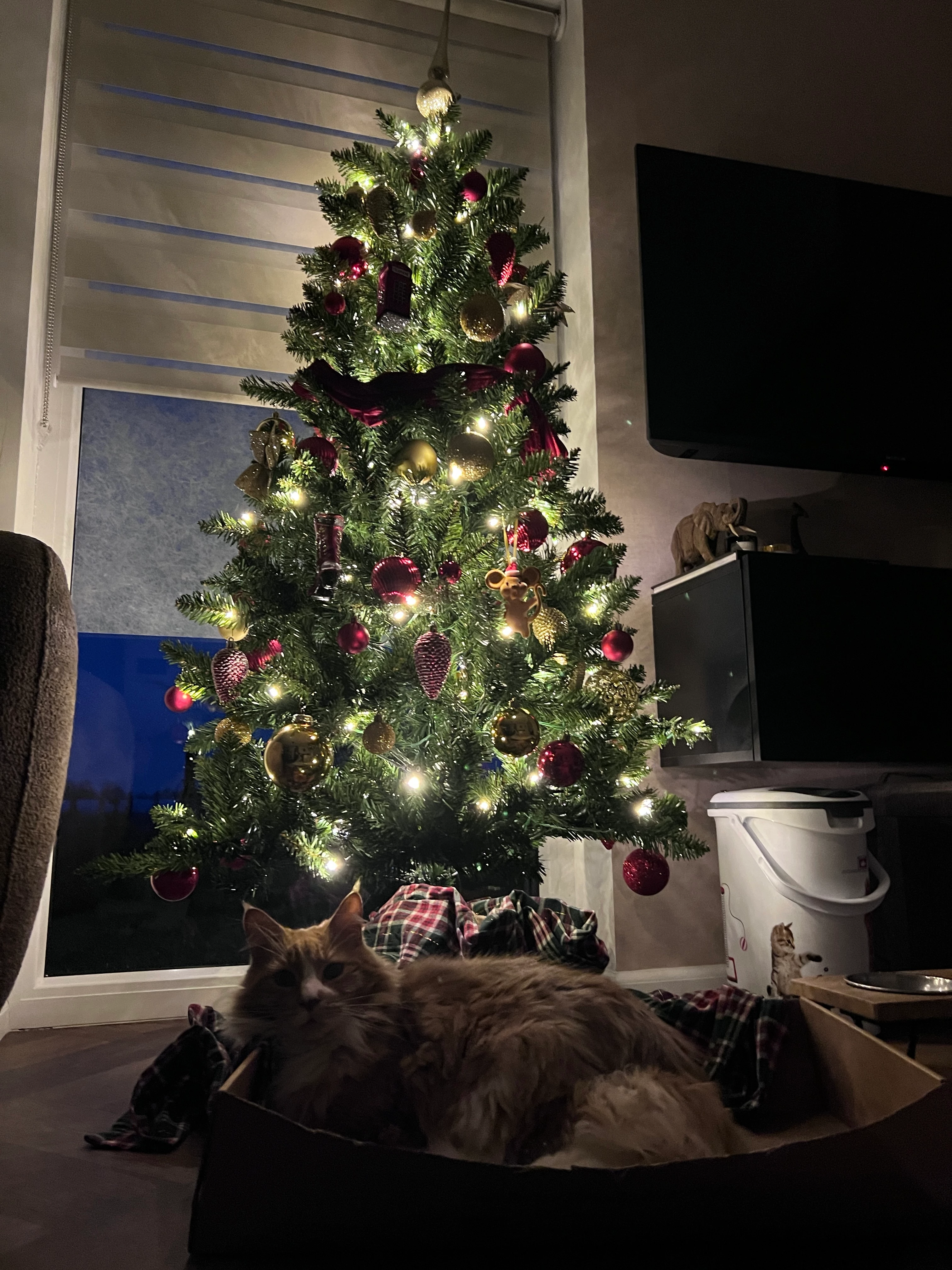Louis kan tussen de andere ornamenten. Twee katten schitteren al in de boom :-)
