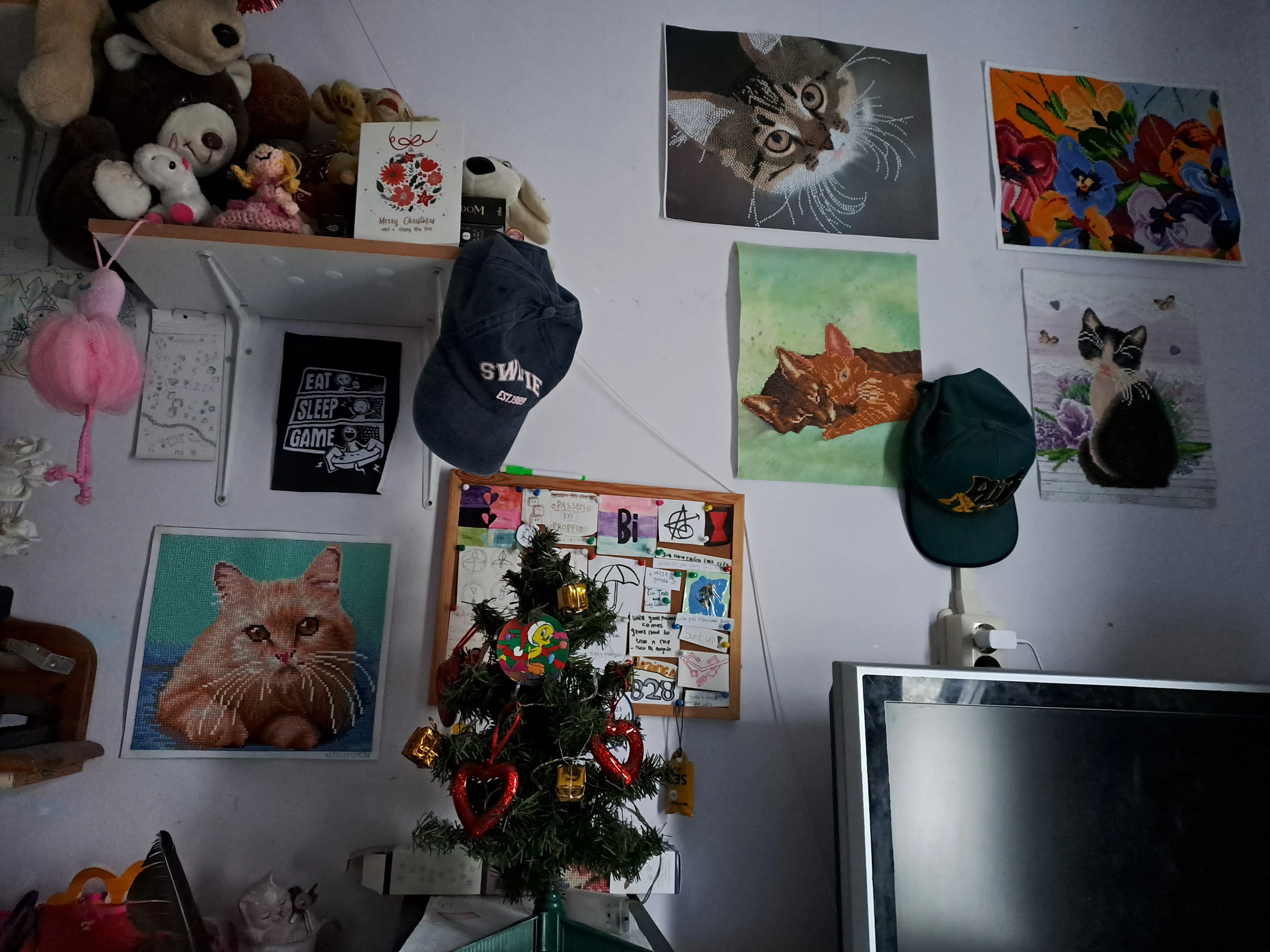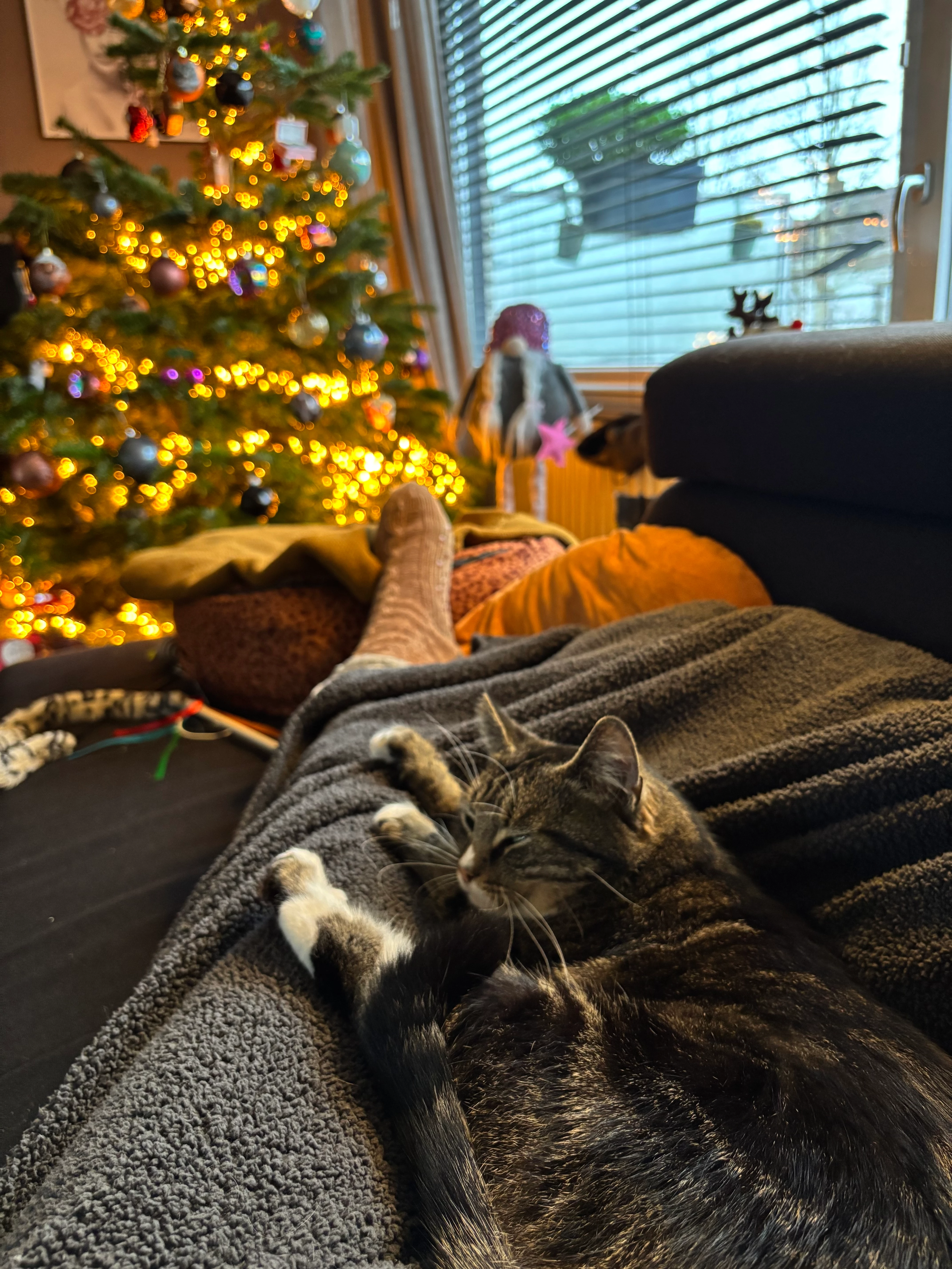 Mauwie en ik kijken tv en naast de tv staat de boom met kerstballen.  Mauwie kan eigenlijk niet met andere katten, maar in de vorm van Louis als kerstbal kan ze sowieso soort genoten in huis hebben rond de feestdagen ( in een boom) wie weet! Fijne kerst.