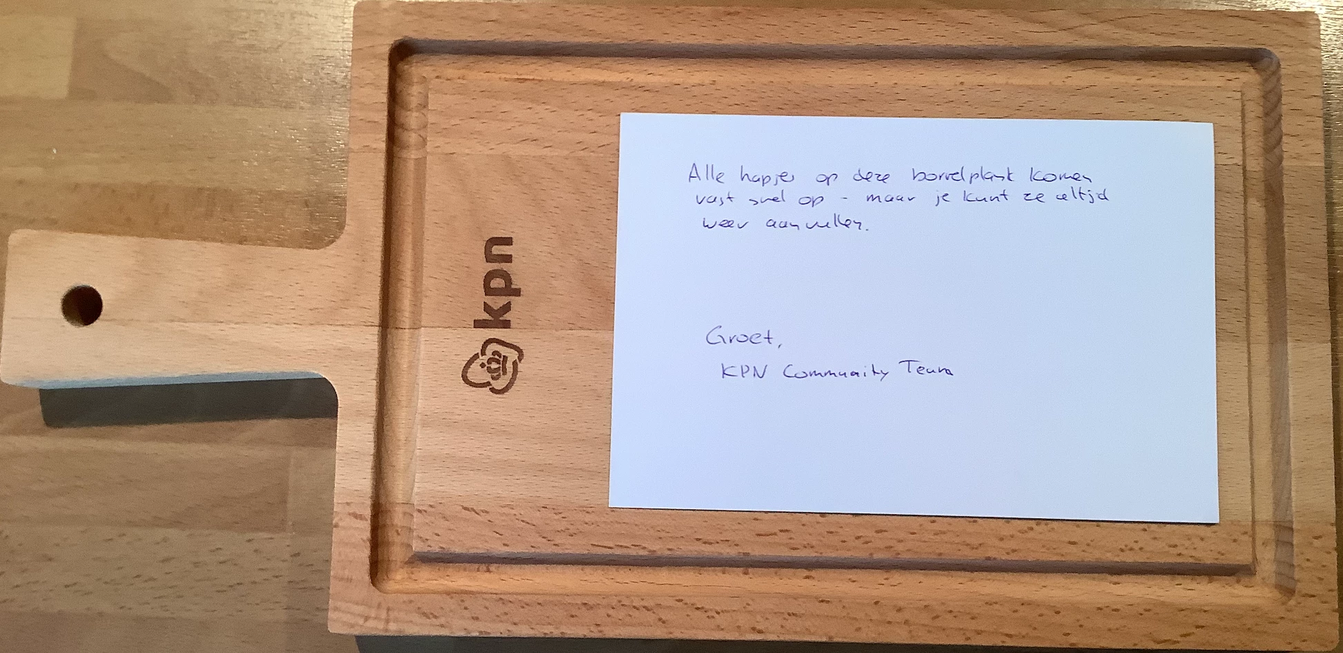 En ja hoor, we hebben de KPN borrelplank ontvangen! Een beetje late reactie maar we waren tijdens de jaarwisseling heerlijk rustig op een vuurwerkvrij huisjespark. Uiteraard hoorden we de knallen van de dorpen in de buurt, maar zowel de hond en wijzelf hebben er heerlijk doorheen geslapen.