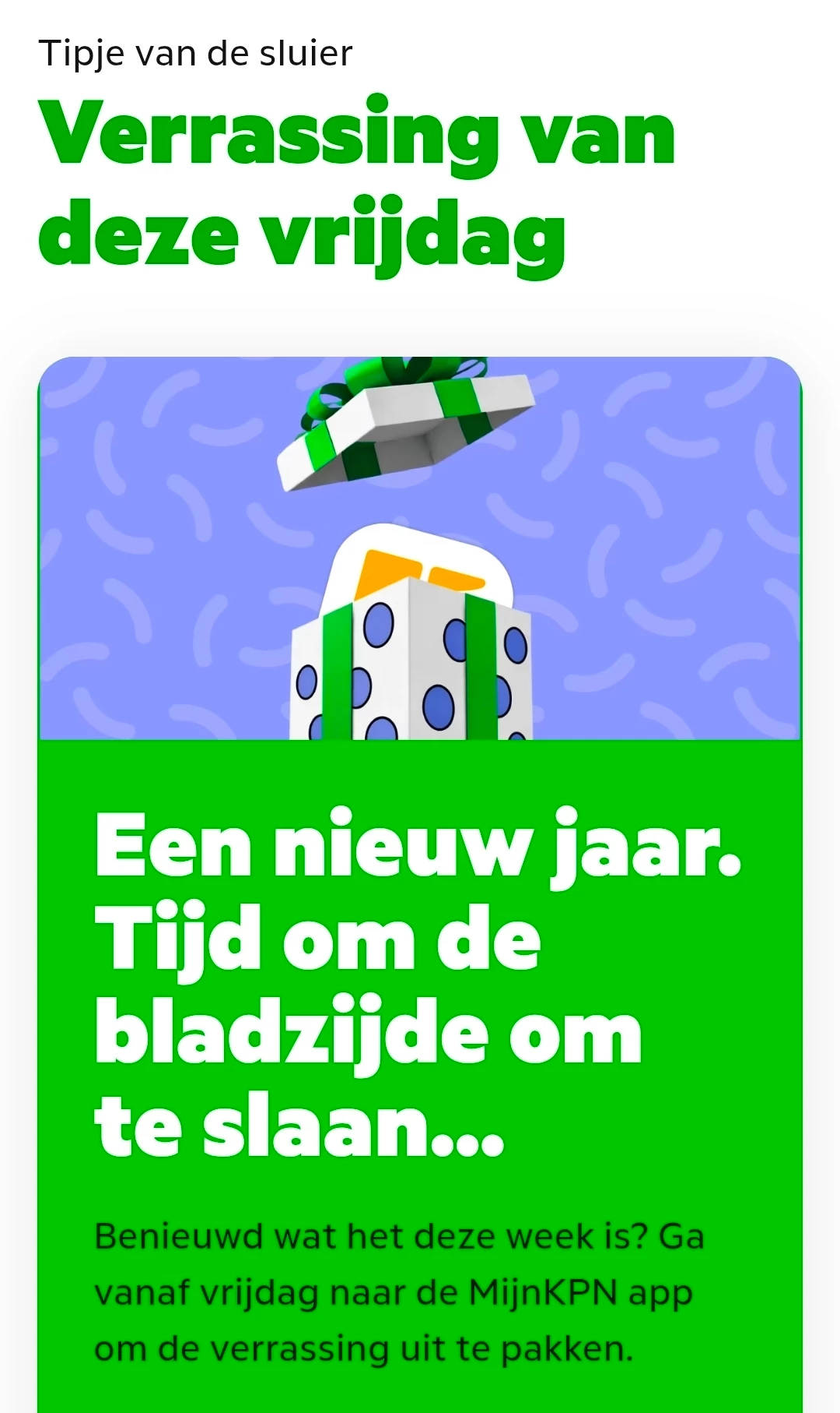 "Binnenkort vind je iets nieuws bij KPN Voor Jou in de MijnKPN app. Iets tofs om naar uit te kijken….. Gewoon, omdat we blij zijn met je!"