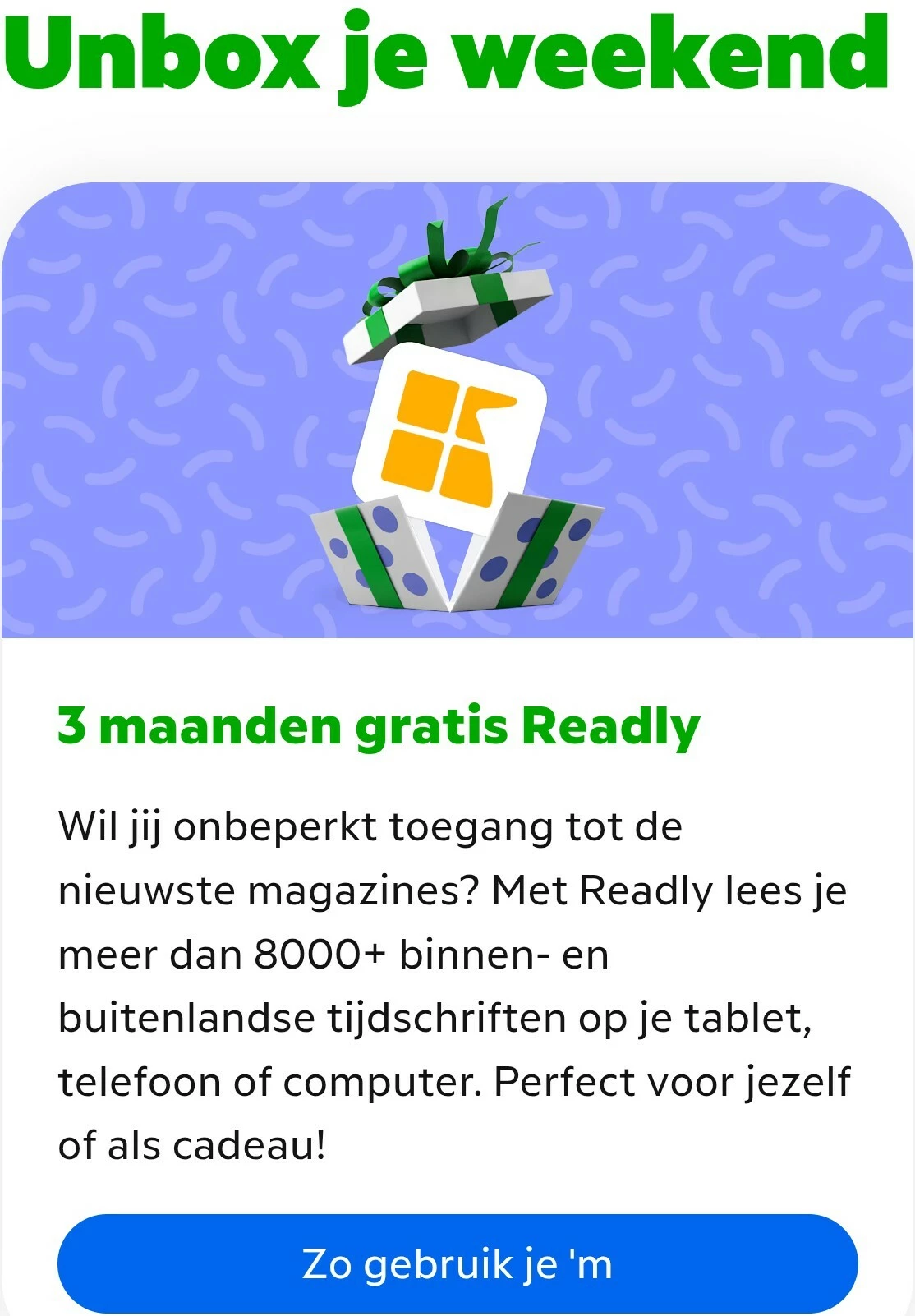 een gratis maand readly (online tijdschriften etc kunnen lezen)