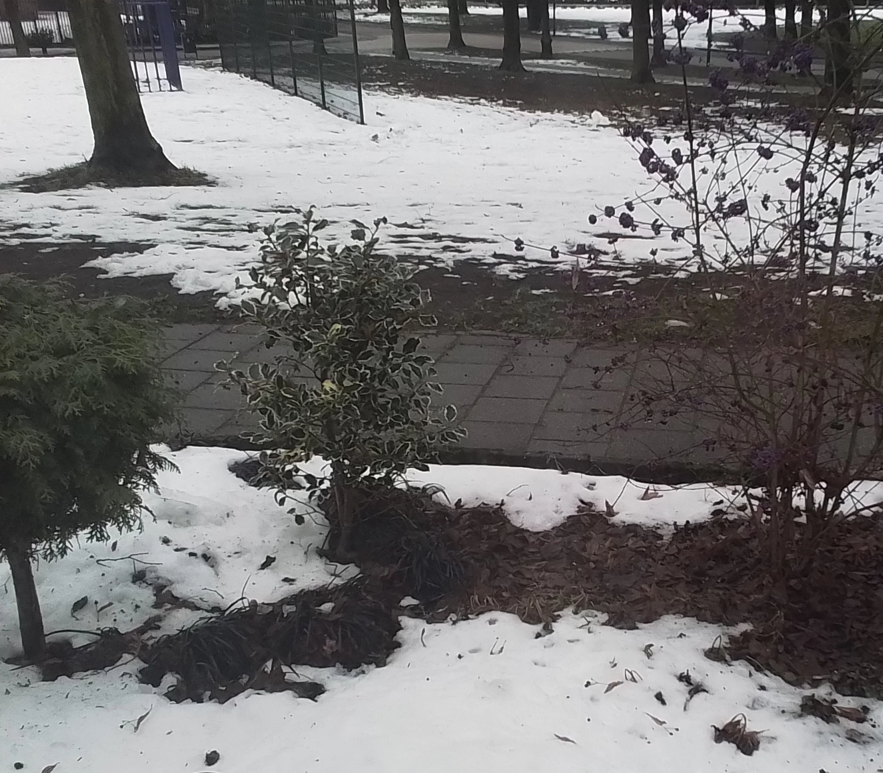 Het smelt hier best snel mede door de regen. Gister was het nog een egaal veel dikker wit tapijt.