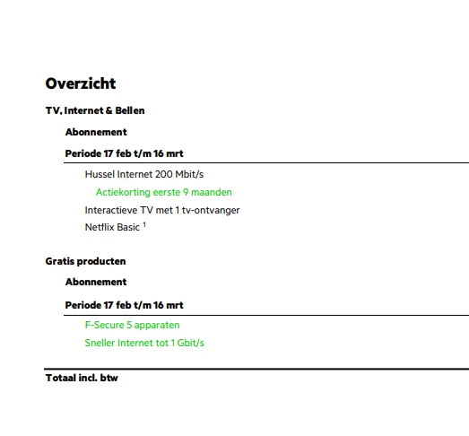Echter zie ik de combivoordeel van entertainmentkorting niet terug. Ook niet in het abonnement wat je hebt afgesloten. Het bedrag voor Netflix basic blijft op 8,99 staan.