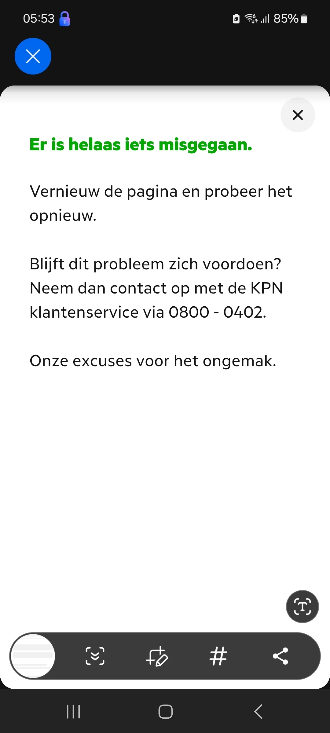Nog een ander probleem: een ander KPN internetabbonement op een ander adres, waar mijn moeder woont, staat ook op mijn naam, maar ik word steeds uitgelogd als ik het abonnement op een of andere manier wil aanpassen. Als ik op manage subscription, adjust internet speed, of view your renewal offer klik, laad de pagina even en daarna word ik uitgelogd. Dit gebeurt op de website en in de app. Het gebeurt alleen met het abonnement van het andere adres. Op mijn eigen adres kan ik wel alles aanpassen zonder dat ik word uitgelogd. Het abonnement van het andere adres loopt bijna af dus wil ik de rewewal offers bekijken voor mijn moeder. Misschien is het voordeliger dan overstappen.