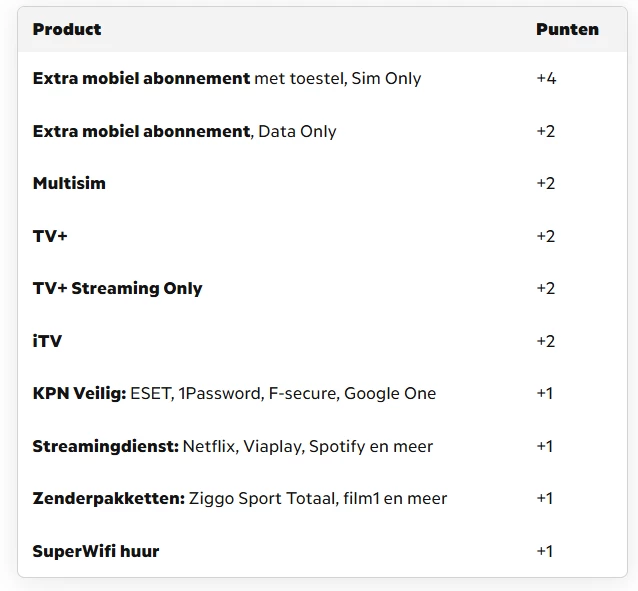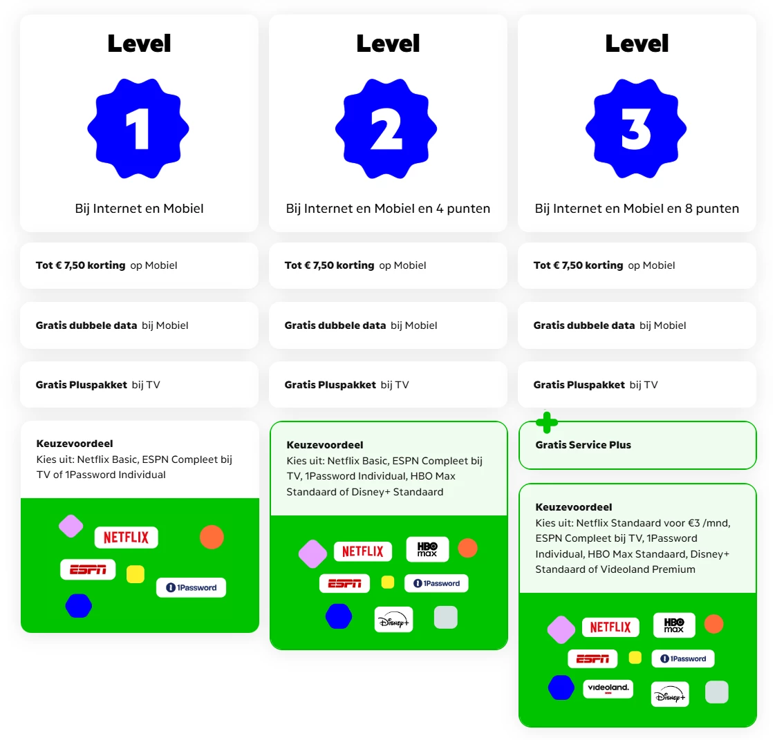 Om in het volgende level voor extra voordelen te komen, heb je punten nodig. Die verdien je door extra producten bovenop Internet en Mobiel te stapelen.