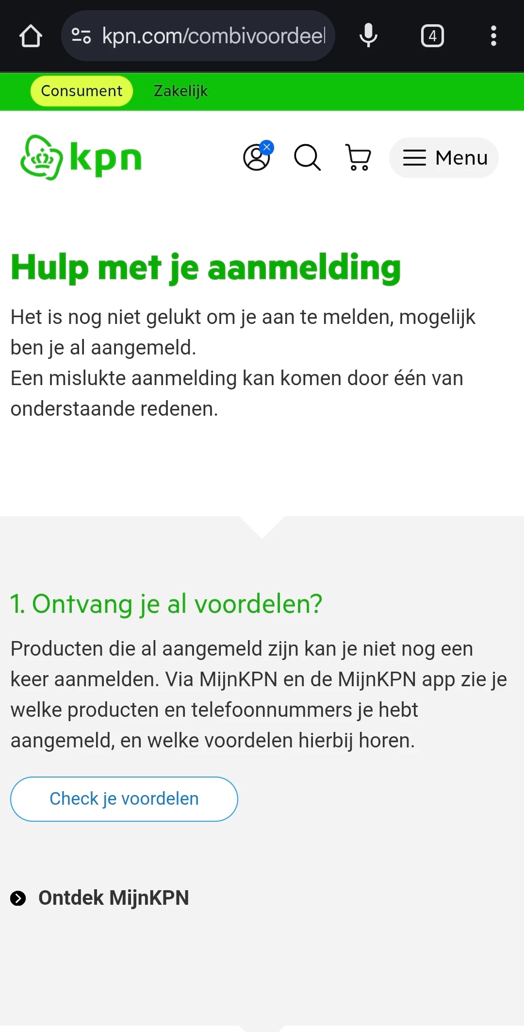 Dan lijkt het erop dat je jouw korting vanwege Combivoordeel nog niet hebt geactiveerd. Er wordt nu dus de bruto prijs in rekening gebracht waar de korting nog niet van afgehaald is. Voor het aanmelden van jouw producten voor de voordelen van KPN Compleet of Combivoordeel (dat is afhankelijk van hoe oud jouw abonnementen zijn) kun je de voordelen zelf nakijken en aanzetten. Controleer eerst of de voordelen actief zijn via MijnKPN