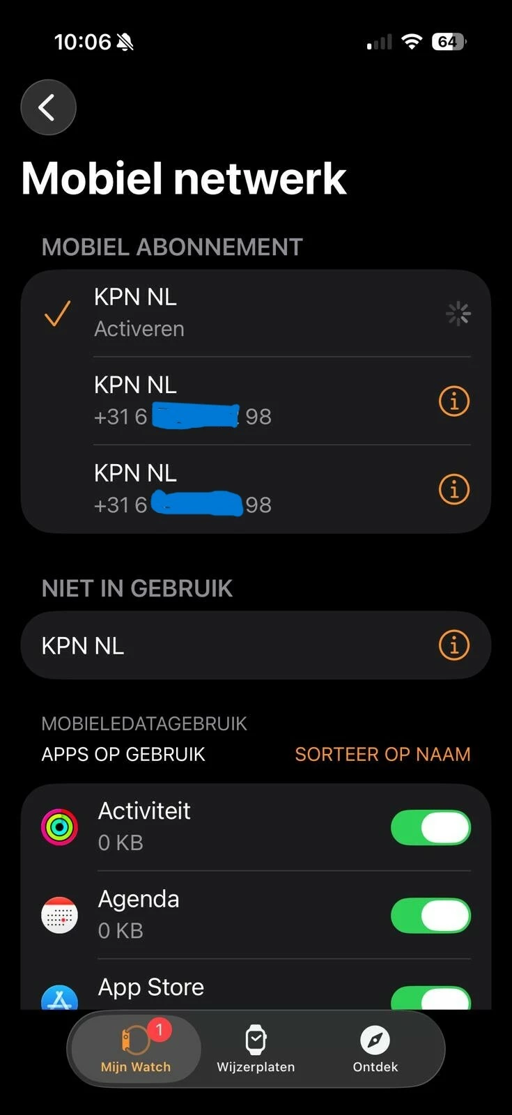 Bij jou lukt het activeren ook nog steeds niet ​@Jasperka? Ik zie trouwens dat je nog geen 06-nummer hebt ingevuld bij je gegevens. En van je Apple Watch heb ik het EID nummer nodig. Die vind je onder het IMEI-nummer in de watch. Als je dat nog aanvult, dan kan ik het doorzetten.