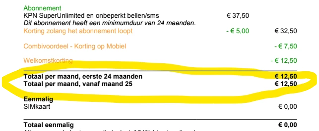 Ik heb in het verleden een discussie gehad met kpn waarin ze in het uiteindelijke contract een korting op een andere manier verwerkt hadden qua einddatum  dan in de eerste bevestiging die ze via de mail verzonden hadden. Kpn bleef toen vasthouden dat het uiteindelijke contract leidend was en dat ze daar niet van af wouden wijken. Ik heb in dit geval het onderstaande in het contract staan waarin ze zeggen dat de prijs na 25 maand ook 12.50 zal blijven. Ik neem aan dat ik ze daar dan ook aan mag houden.