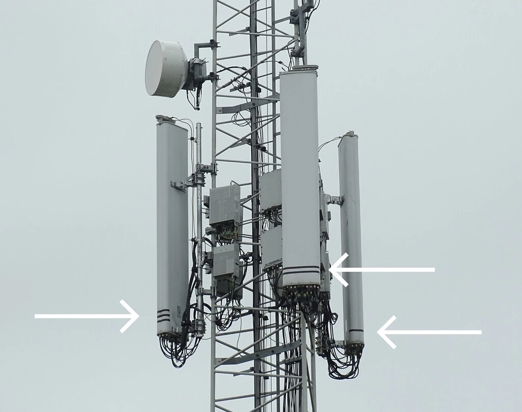 De meeste KPN antenne's zijn te herkennen aan de zwarte strepen onderaan. En natuurlijk aan de kasten die op de grond staan waar KPN op staat. Zie hieronder: