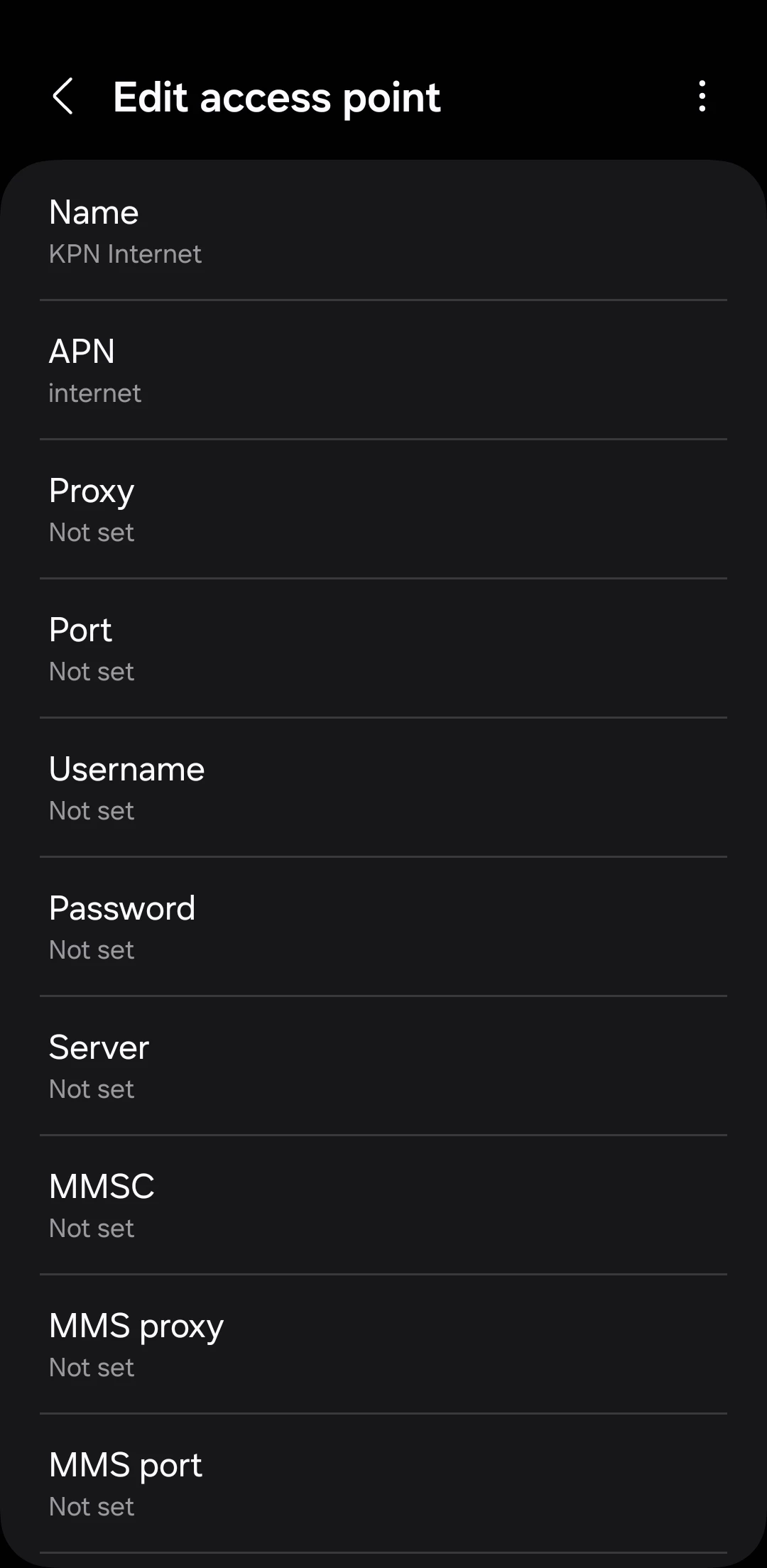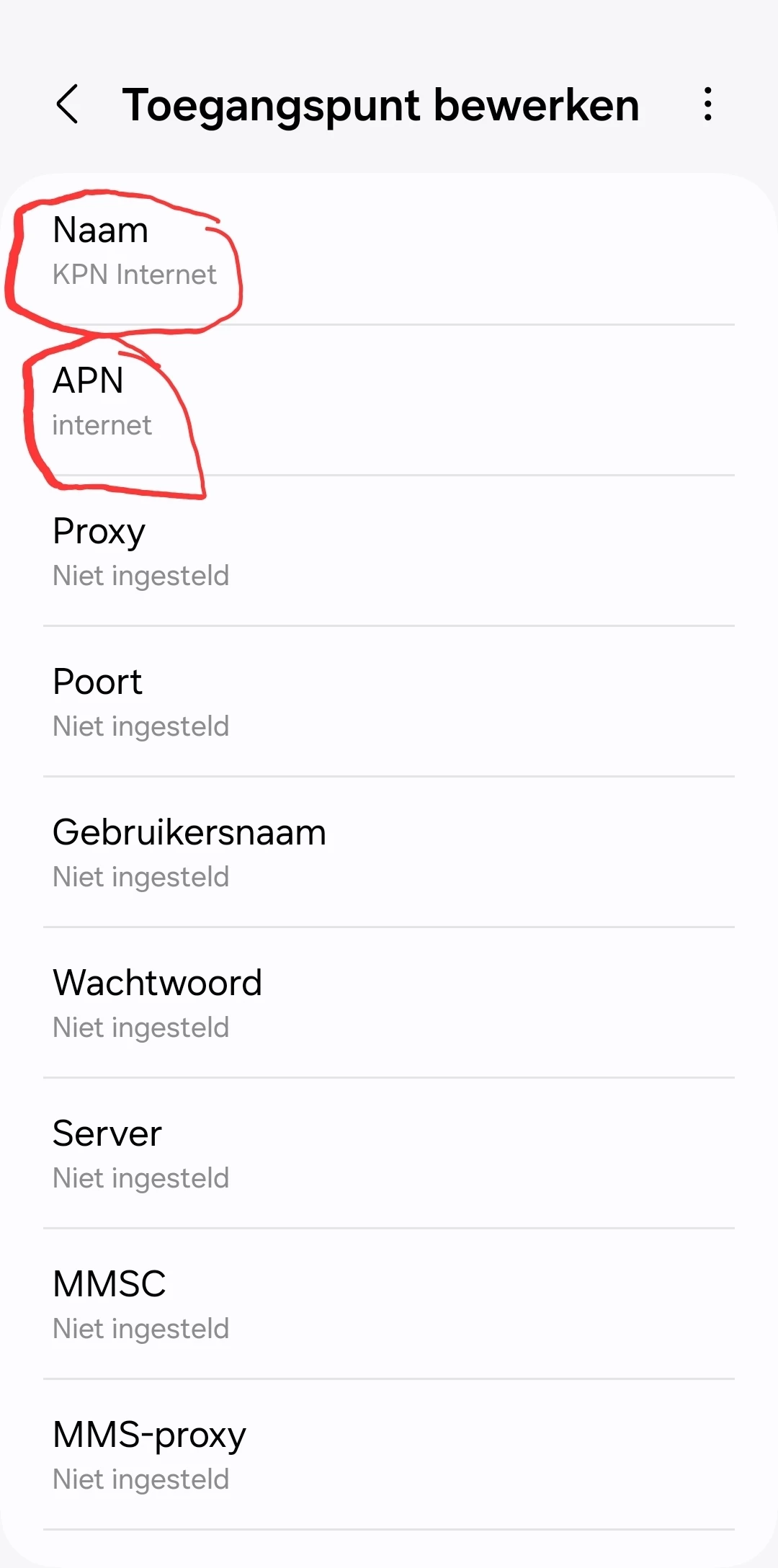 Kun je voor de zekerheid bij Access Point Names de inhoud van "KPN internet" laten zien?