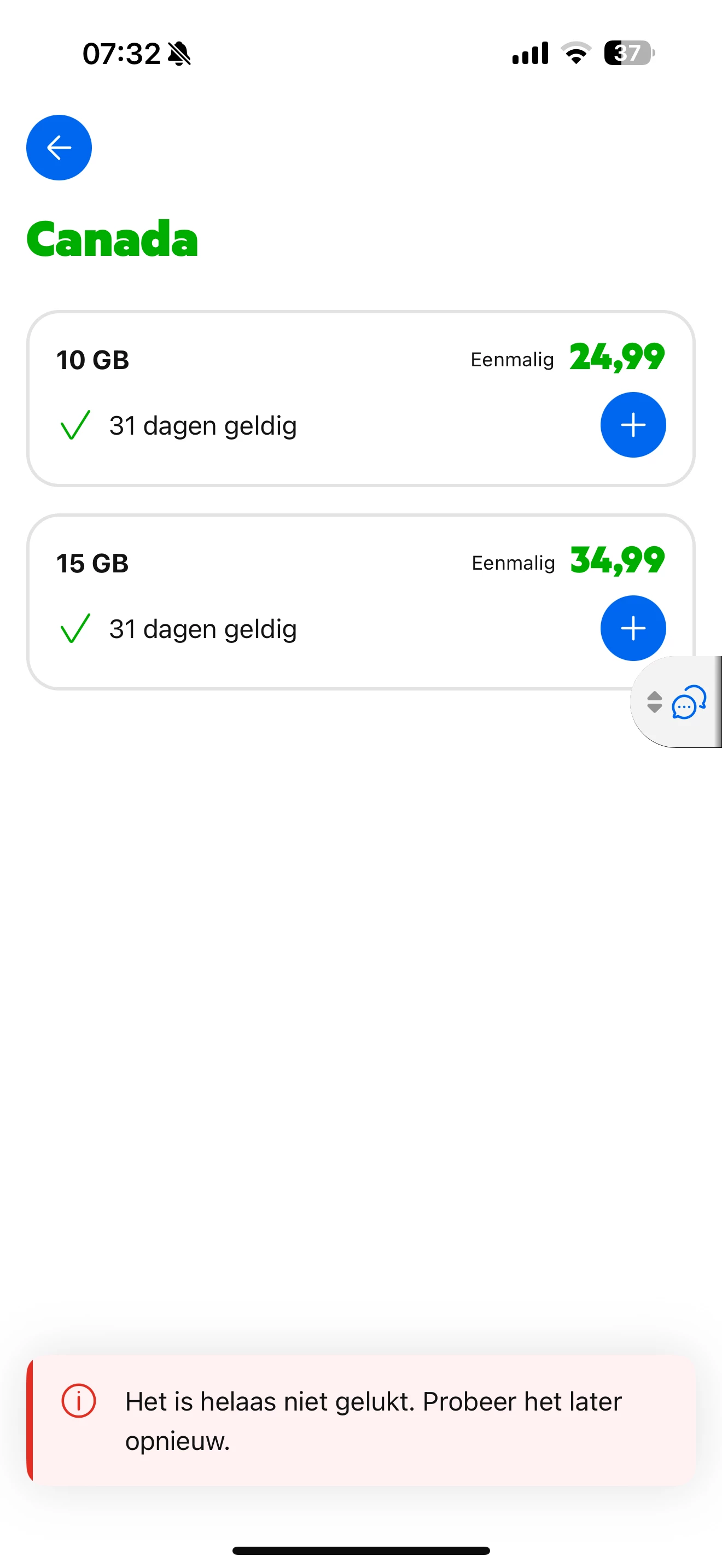 Databundel Canada activeren lukt niet, “het is helaas niet gelukt, probeer het op een later moment”
