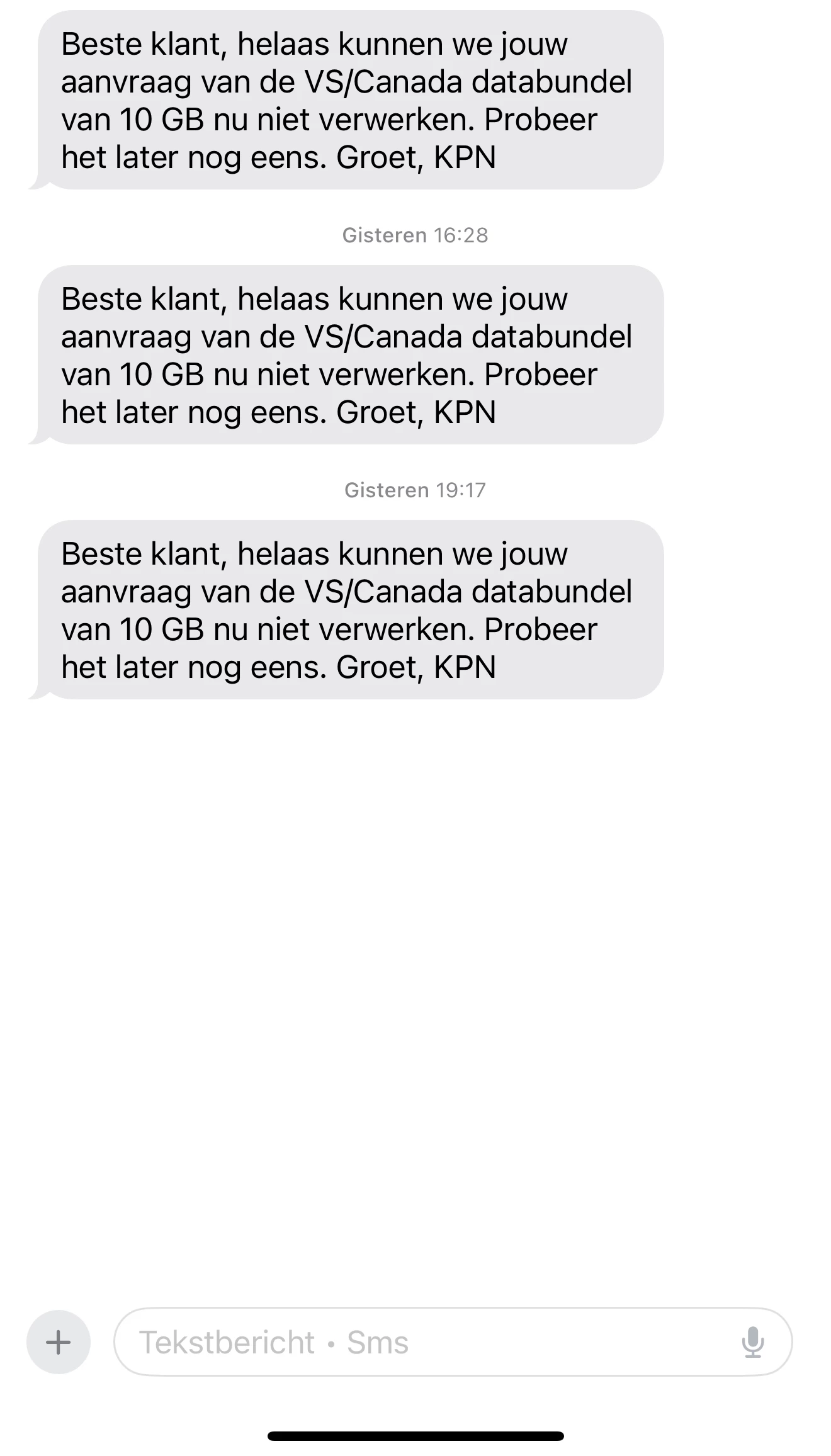 “Beste klant, je bestelling of wijziging van VS/Canada bundel 10 GB is verwerkt. Ga naar MijnKPN (kpn.com/mijnkpn) voor meer informatie. Groet, KPN”