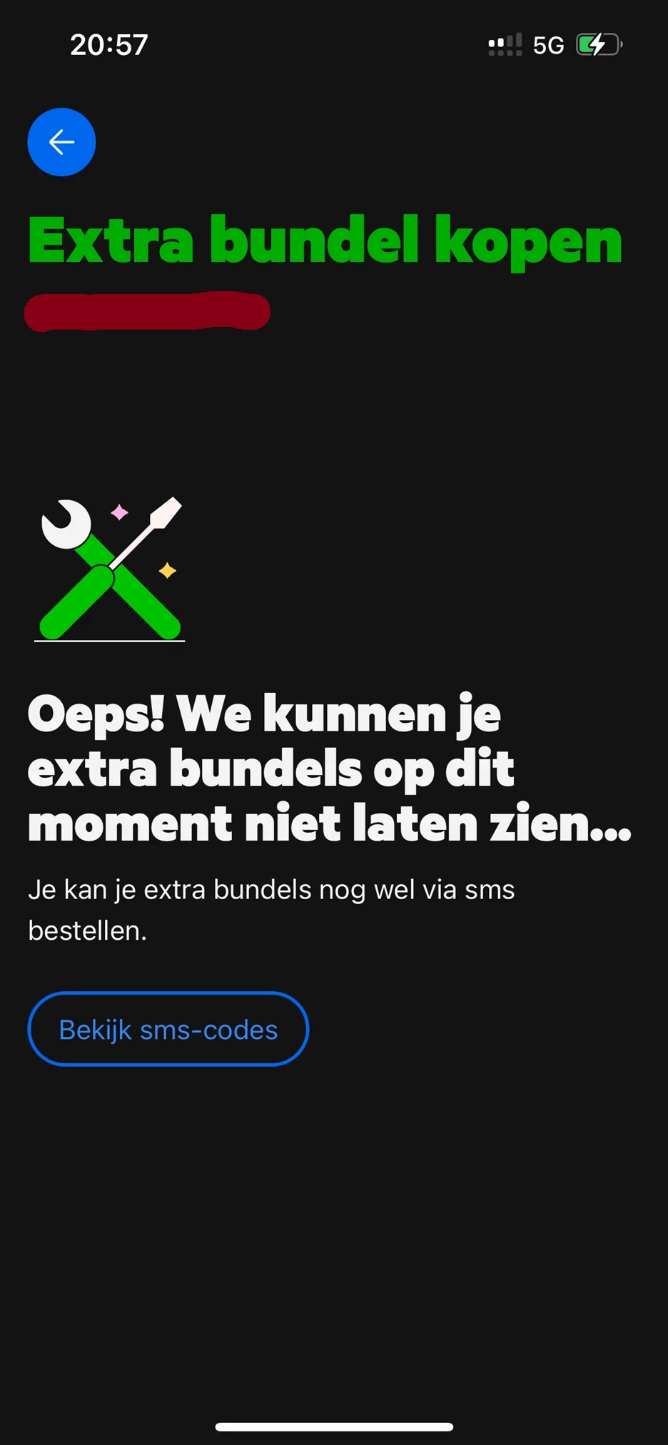 Hallo ​@Lianne Berends, welkom bij de community en leuk dat je ons hebt gevonden! Ik zie dat ​@Noordzee de gouden tip al had gegeven, heb je al geprobeerd de app te verwijderen en opnieuw te installeren? Ik heb zojuist zelf even in de app gekeken en ik zie er momenteel geen storing in, mogelijk dat de app het ook alweer doet bij jou? Inderdaad zoals de app zelf ook al liet zien, als alternatief kan je altijd een bundel aanschaffen via de sms-codes. Laat je weten of het is gelukt?😊