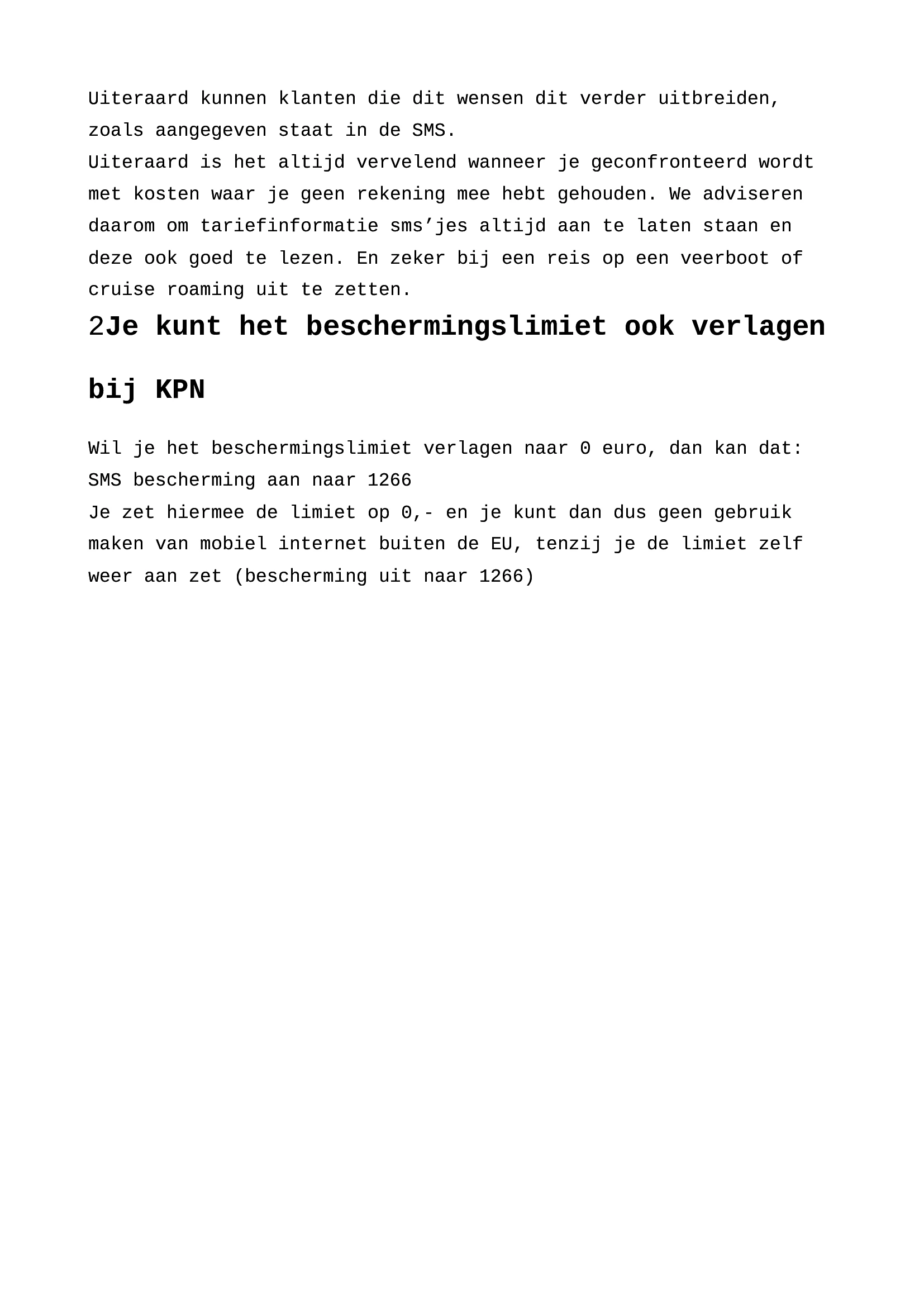Binnen Europa kan je internet gebruiken zoals je thuis gewend bent. Maar buiten Europa kost dit extra en betaal je per MB al gauw € 2,50 en voor satelliet netwerken (zoals op de veerboot) zelfs € 10,-. Om jou te beschermen tegen extra hoge kosten, blokkeren wij internet buiten Europa als je een bedrag van € 60,50. We raden je daarom ook altijd aan om roaming uit te zetten als je geen onverwachte kosten wilt. Wil je liever helemaal geen data buiten Europa kunnen gebruiken? Sms dan bescherming aan naar 1266. Hiermee zet je het limiet buiten Europa op € 0,- en kan je dus geen data verbruiken tenzij je een databundel hebt.