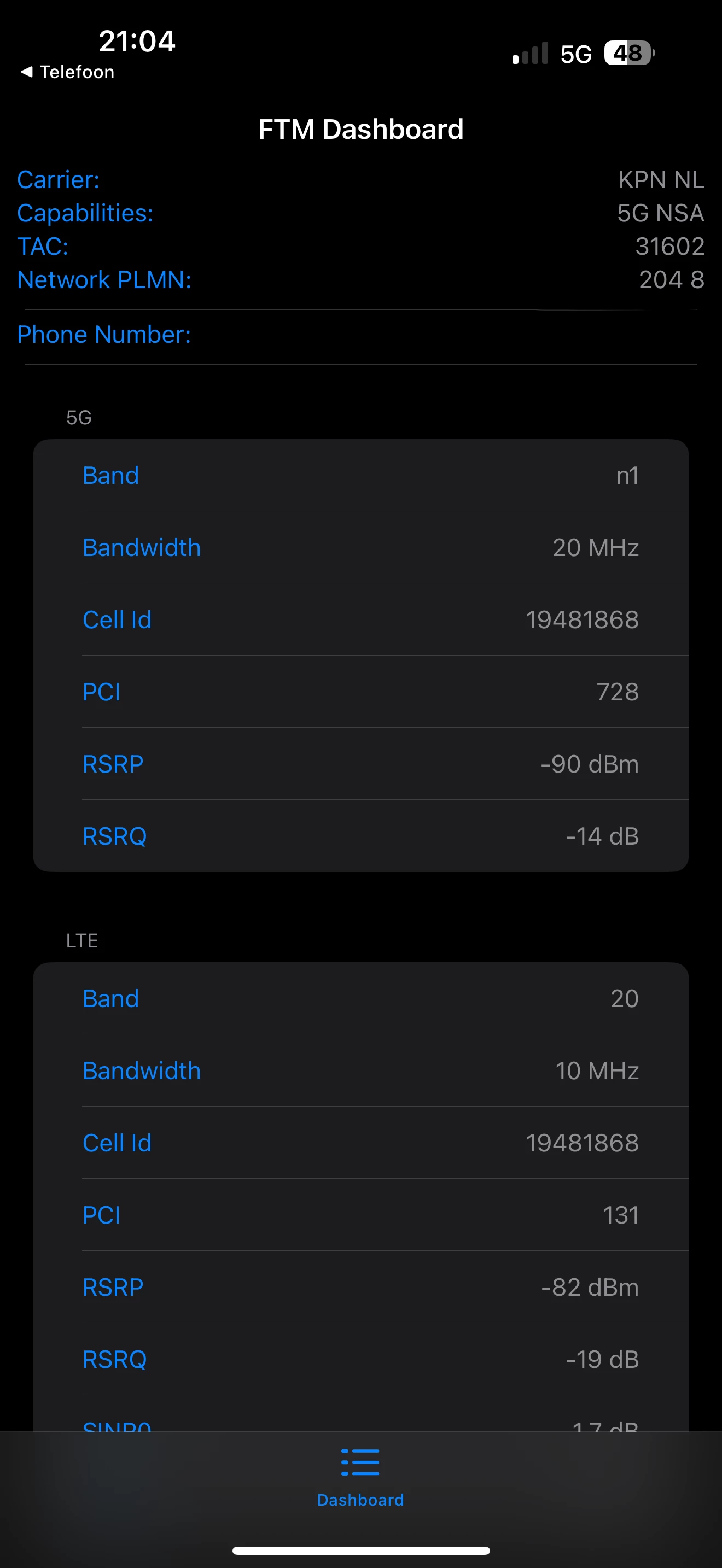 ​@MitchSouthĀ Open phone app met Wifi uit en tikĀ *3001#12345#* om te komen in Field Test Mode. Daar kan je signaal sterkte en signaal kwaliteitĀ RSRP/RSRQ/SINR zien
