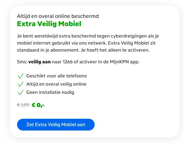 "Vanaf nu is Extra Veilig Mobiel standaard onderdeel van je mobiele abonnement. Daarmee maken we internetten op je mobiel veiliger. Vanaf 1 juni 2026 betaal je hier € 1,- per maand meer voor.”