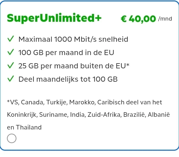 Een van de twee 0970 abonnementen heeft ook een daglimiet van 20 GB in Nederland. Rest EU 40 GB per maand. Dat is Unlimited50. Waarbij de 50 inhoud TOT 50 Mb/s.