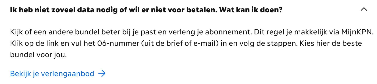 Als je een andere bundel wilt, of je abonnement wilt verlengen, kijk dan in de MijnKPN app naar je verlengaanbod. Mocht je even contact willen hebben, maak dan een belafspraak via het linkje dat Flitsend hierboven deelt. We bellen je dan terug om met je door te nemen welk abonnement het beste bij jou past.