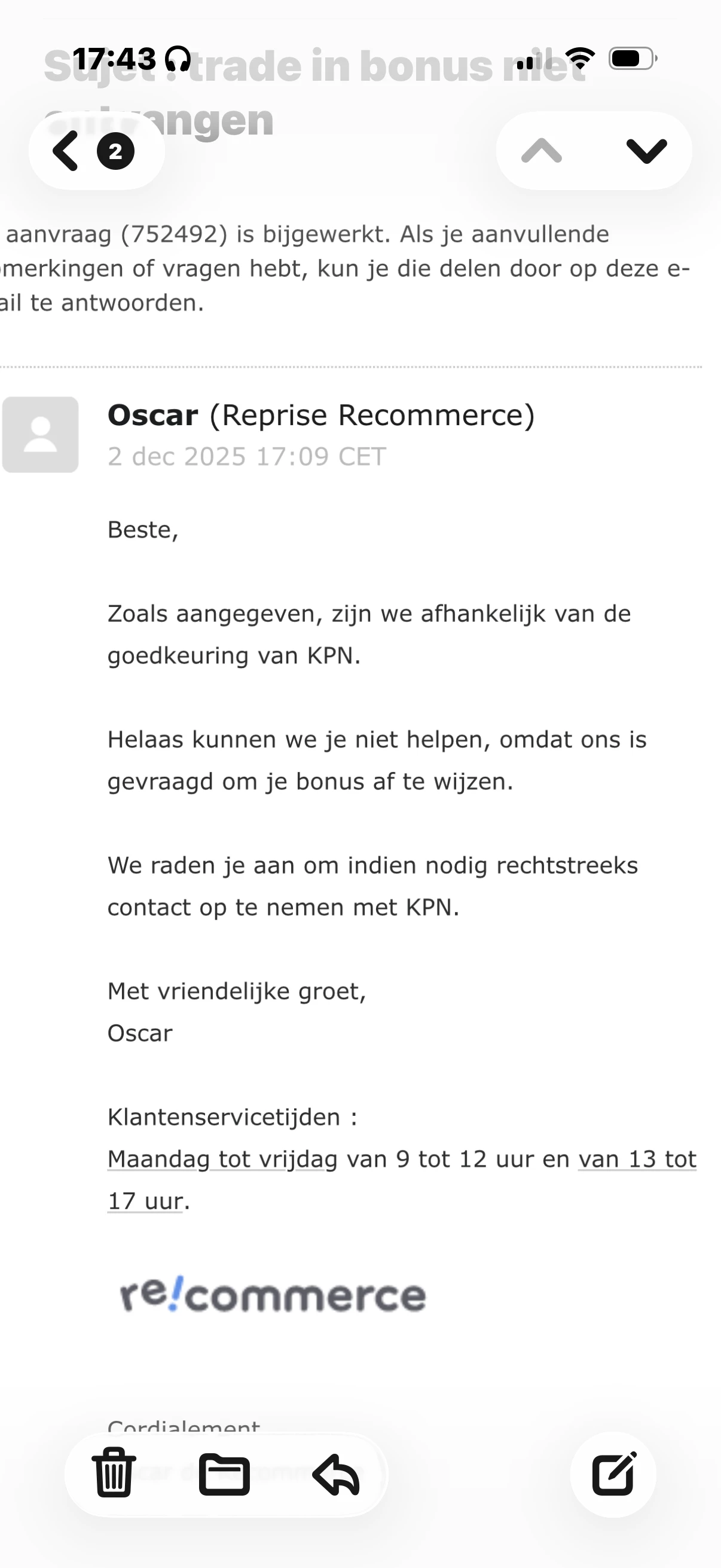 Ben al 2 maanden bezig om 150 bonus te ontvangen. Iphone 17 + inruil telefoon i.s.m recommerce . Waardeloos hoe jullie KPN hiermee omgaan niet terugbellen  afspraken niet nakomen en dat geld ook voor Recommerce. Ik ben KPN klant en ga de actie met jullie aan los het dan ook op en hou iemand niet 2 maanden aan het lijntje.K68C5523729616. Sorry maat het liefst zeg ik alles op, want dit hadden jullie allang moeten oplossen.