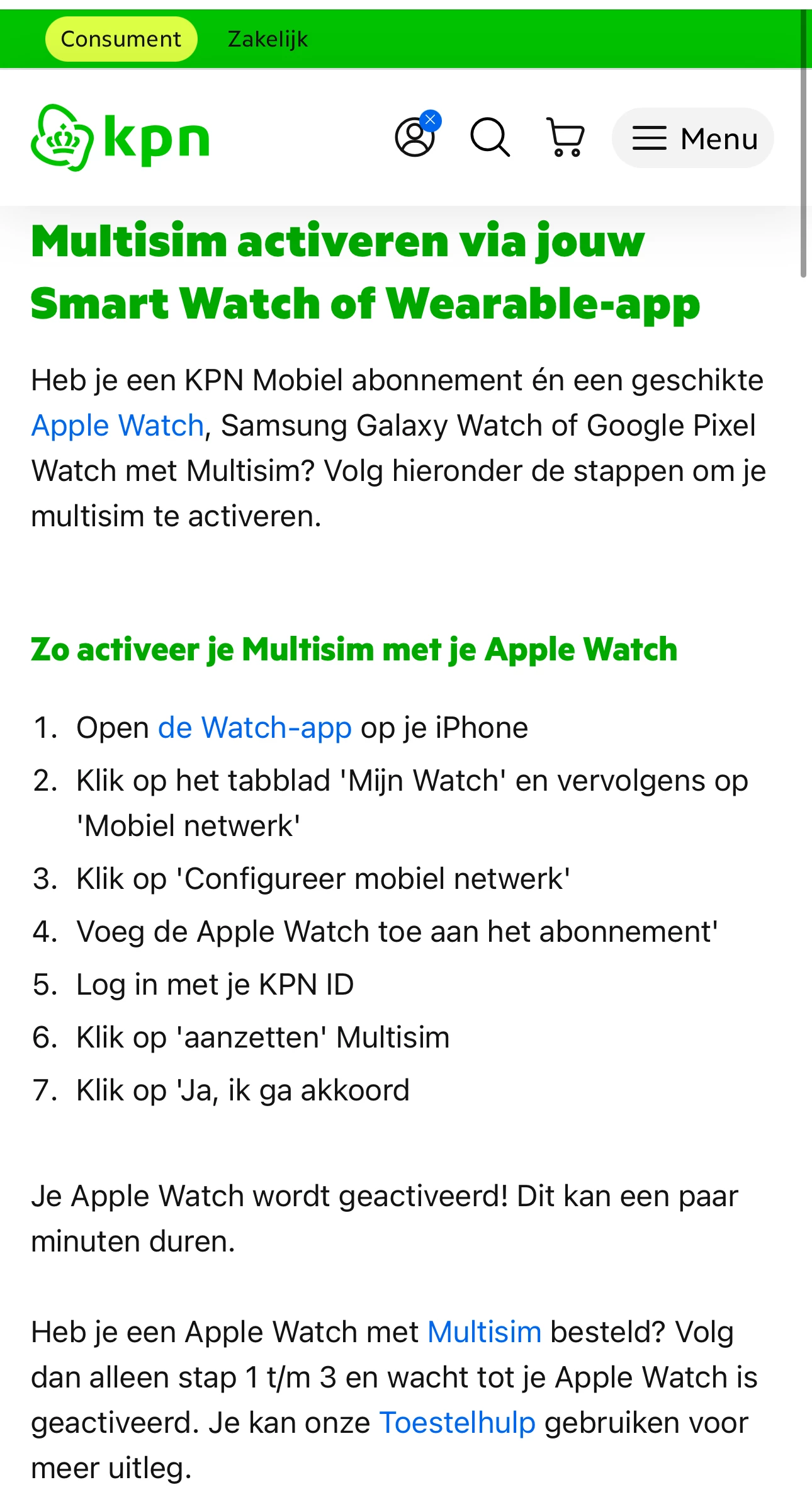 dat heb ik nu twee keer gedaan. Een keer de KPN winkel in mijn woonplaats bezocht en een keer naar een Apple winkel geweest. Gezien de post history van deze thread lijkt het mij een breder probleem.  Ook ik heb de melding “your account is not eligible to enable mobile service Apple Watch”. Ik zal maandag nog een keer bellen.