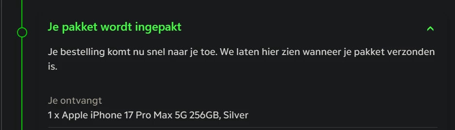 Ik heb mijn iPhone 17 Pro Max 256GB Silver bij KPN besteld op 19 september om 14:15 uur.