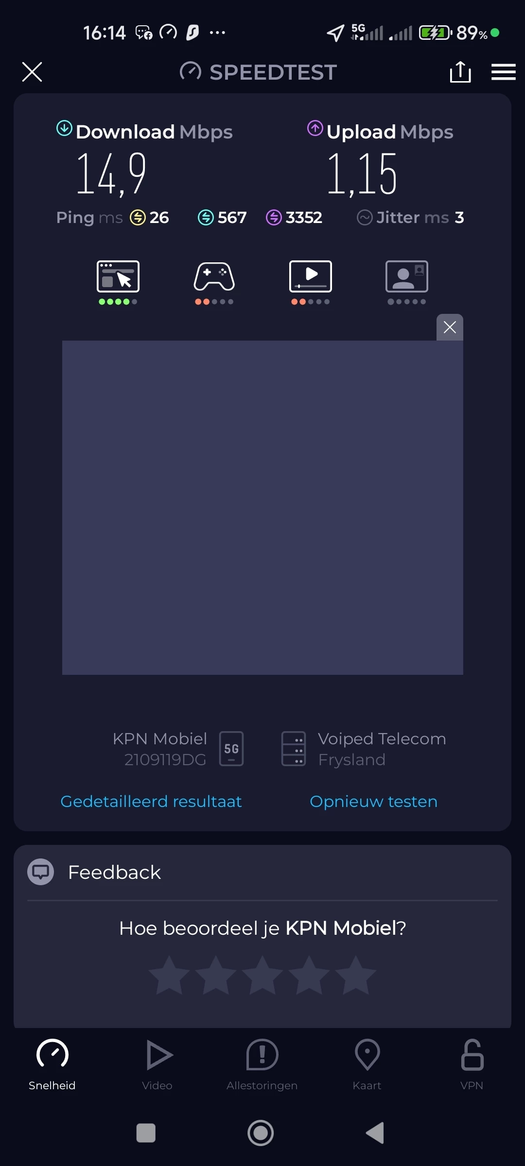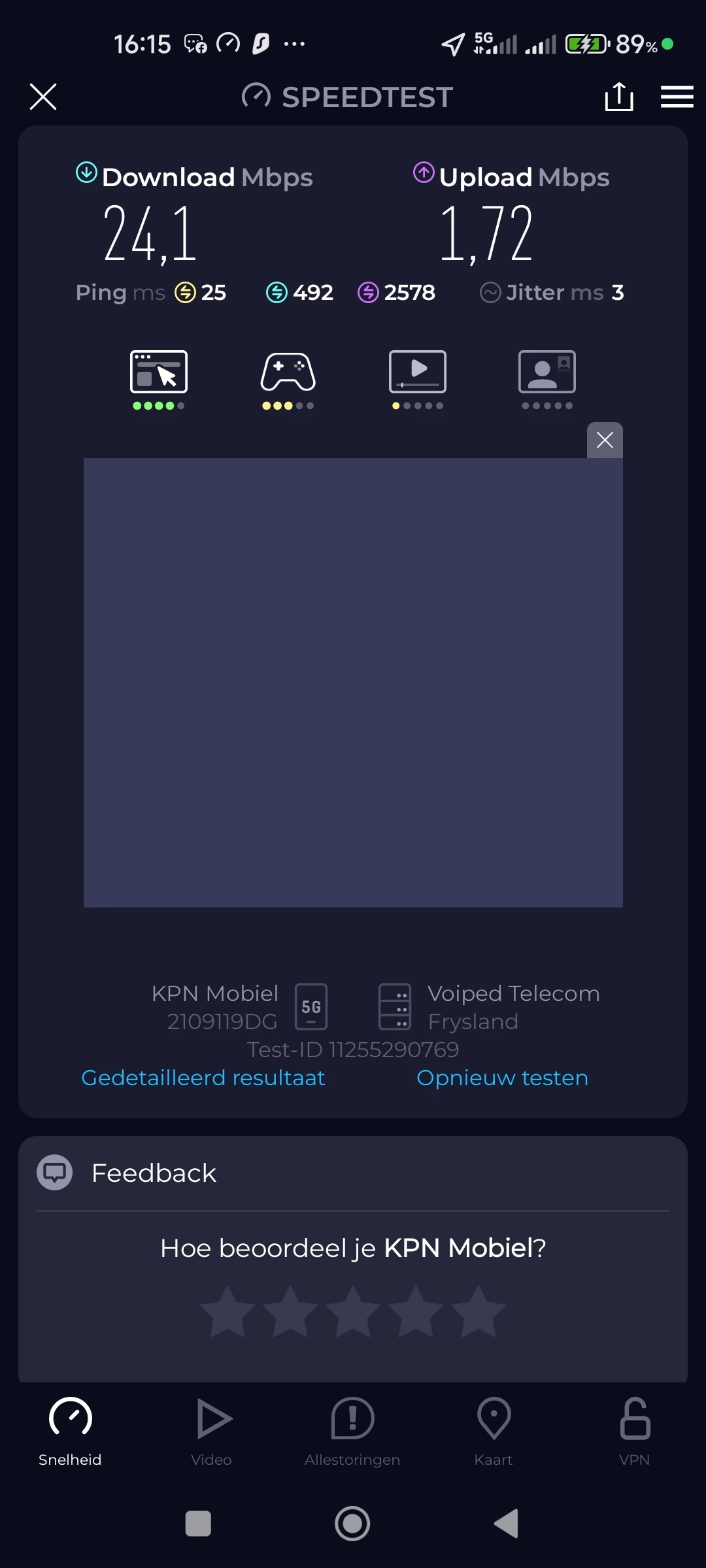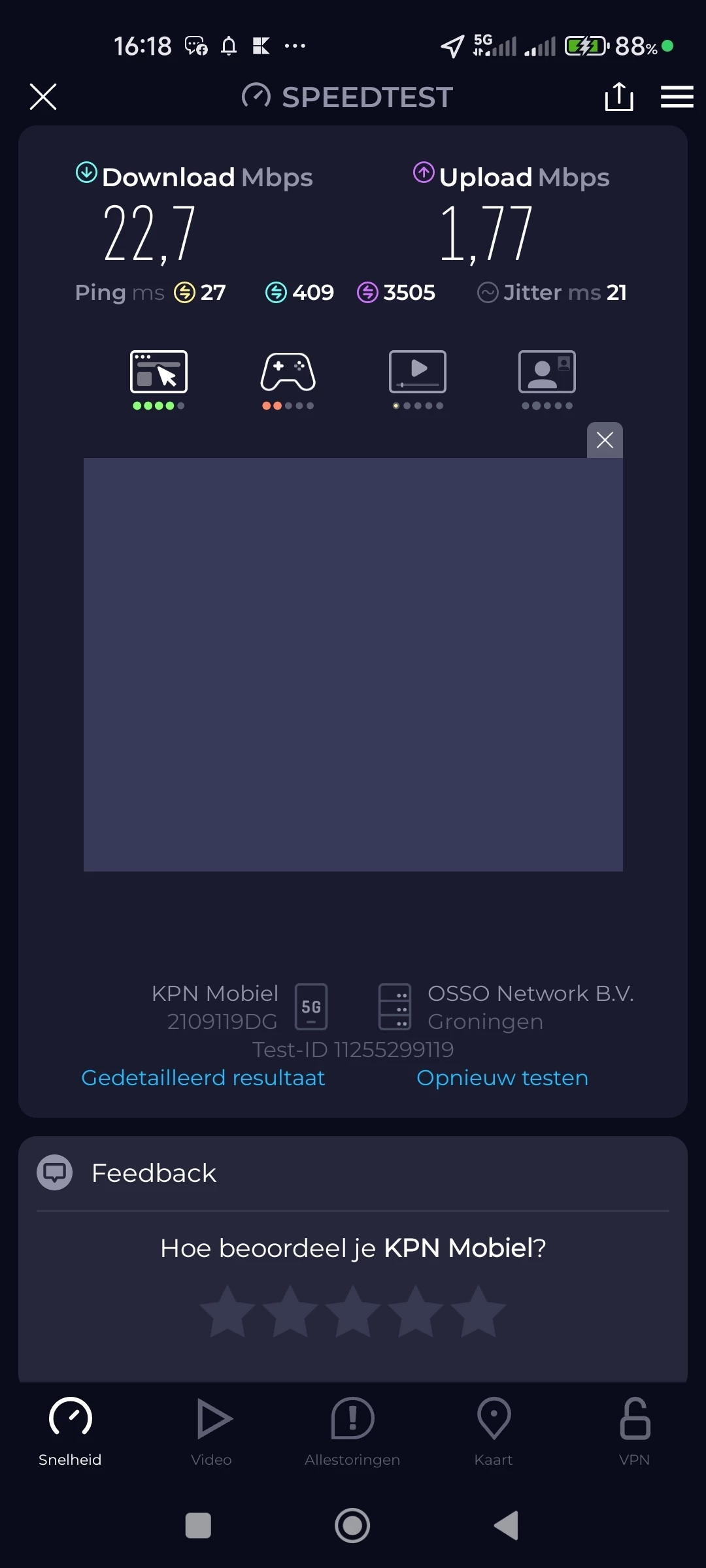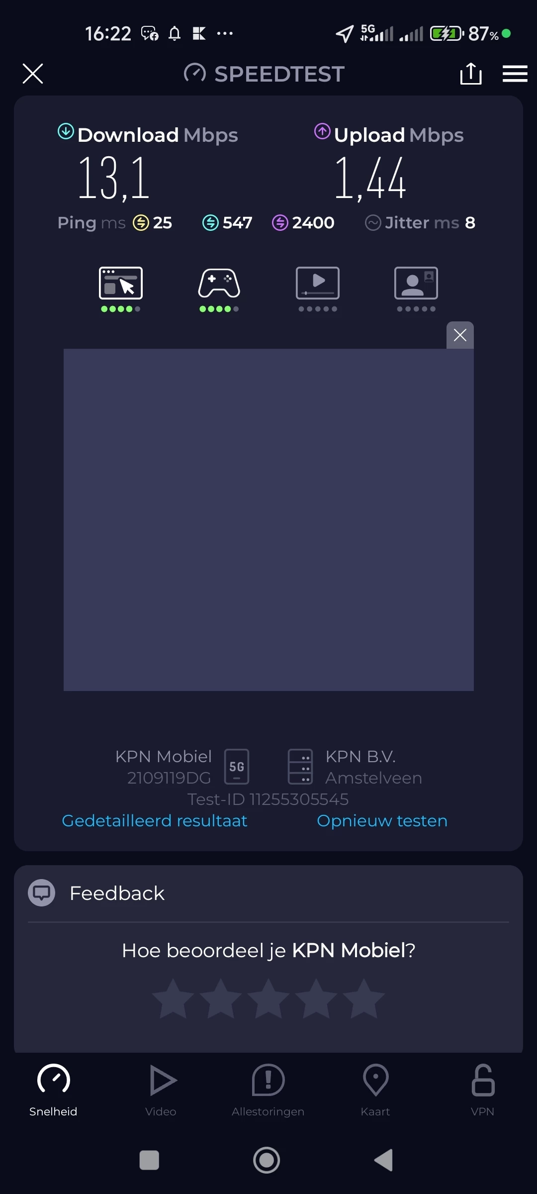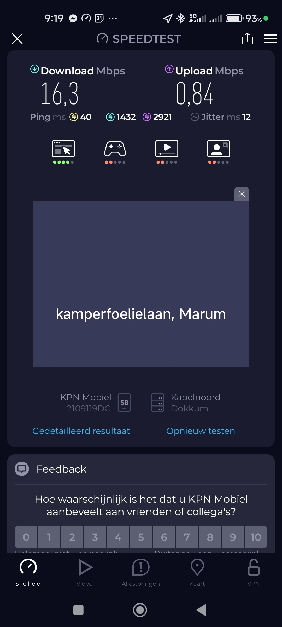 Ik wil graag mijn ervaringen delen en wellicht advies of steun vragen rondom mijn problemen met de mobiele internetsnelheid bij KPN in de regio Marum. Volgens de KPN dekkingskaart zou hier een gemiddelde snelheid van ongeveer 332 Mbps beschikbaar moeten zijn. Echter, mijn eigen metingen met speedtests laten een heel ander beeld zien. Mijn downloadsnelheid varieert meestal tussen 10 en 40 Mbps, en de uploadsnelheid ligt vaak tussen 0,7 en 4 Mbps. Dit is significant lager dan wat KPN belooft en wat voor mijn dagelijks gebruik, waaronder werk, nodig is.
