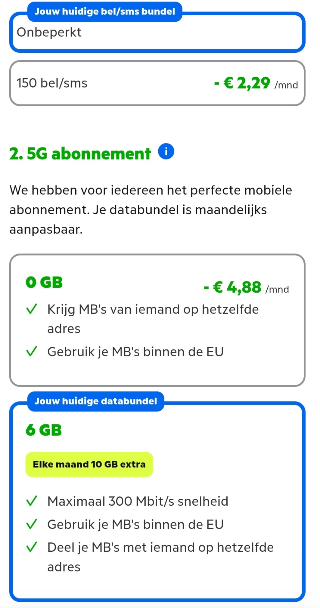 Ik zit nu al geruime tijd bij KPN, ik kom de laatste tijd niet helemaal uit met mijn MBs dus wilde ik mijn abonnement verhogen. Als ik deze nu van 6gb naar een grotere bundel wil vergroten krijg ik de melding dat ik mijn maandelijkse 10gb extra kwijt raak.