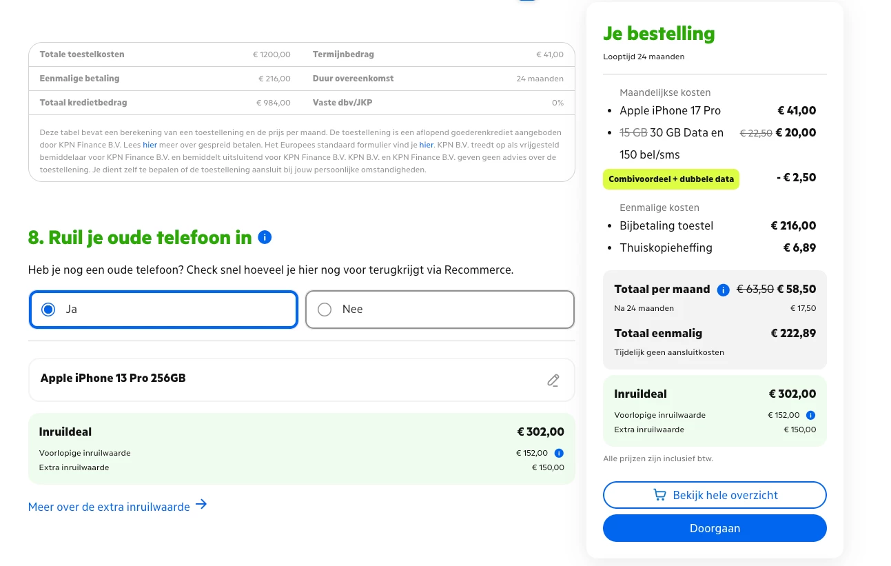 Thank you for your detailed explanation. I completely understand how frustrating this must feel. You make a decision based on what is shown during the ordering process, and when the confirmation reflects something different, that understandably causes disappointment. We truly regret that this has led to confusion. Unfortunately, as a Community moderator, I do not have the ability to adjust promotions, trade-in values, or contract terms. The KPN Community cannot modify or correct commercial offers after an order has been placed. These matters are handled exclusively by the commercial department or customer service.
