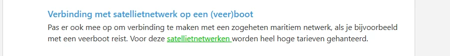 Op veerboot van Denemarken naar Noorwegen ontvang je een SMS van KPN dat gebruik wordt gemaakt van een satelliet verbinding met kostenplaatje. Als je niet internet echt uitzet wordt er toch gebruikt (tot wettelijk max 60€). Ik vind het geen stijl van de KPN dat ze dit niet in de SMS vermelden en ook niet wat je kan doen om het te vermijden (vliegtuigstand of SMS sturen naar 1266 met bescherming aan ). Het is dus een gewoon ordinair verdienmodel van de KPN.