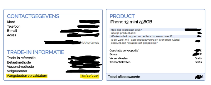 In de PDF in de bijlage in de mail van Recommerce met verkoopdocument en retourlabel staat bij Aangeboden vervaldatum 30/11/2025.