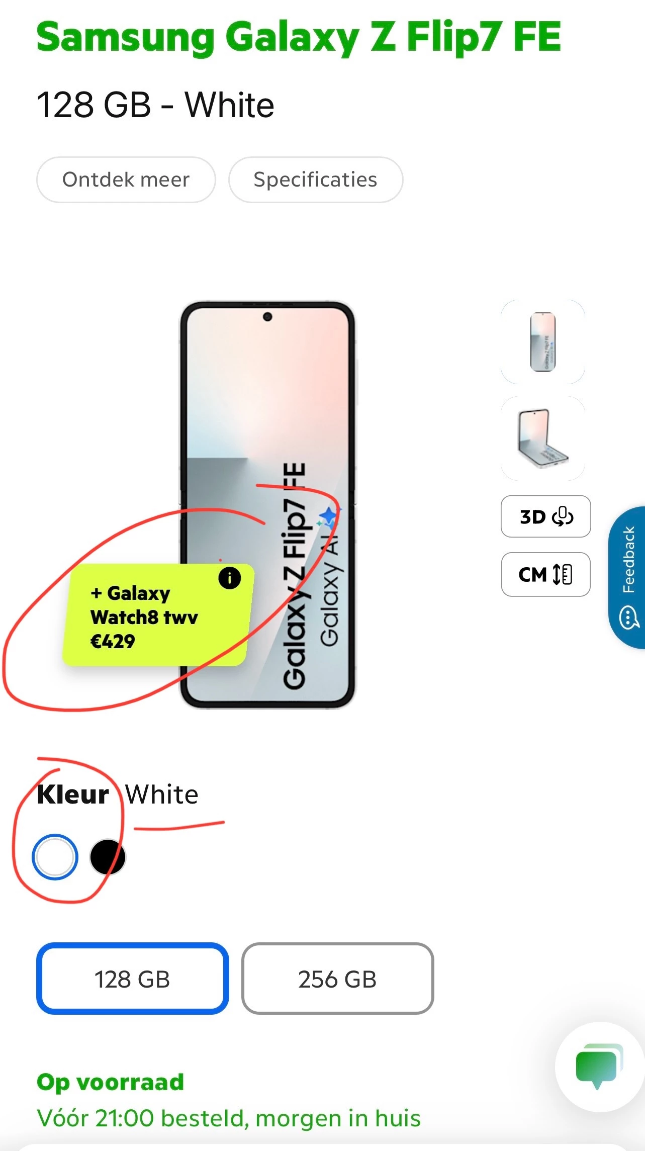 Samsung heeft mij een lijst doorgestuurd via Whatsapp met alle deelnemende toestellen en daar staat de witte Flip 7 FE niet tussen waar nogmaals, op KPN.com wél mee geadverteerd wordt! Alleen de Black variant….. Dit is dus misleiding!