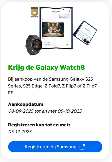 Al jaren klant bij KPN met mobiele tel en internet. Week geleden heb ik mijn abonnement weer verlengd met 2 jaar en de nieuwste Samsung Flip7 FE White erbij aangeschaft. Hier staat expliciet in de advertentie +Galaxy Watch8 twv € 429,-