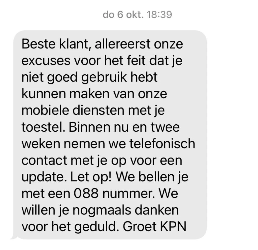 6 oktober het bericht ontvangen dat er binnen 14 dagen contact met mij zou worden opgenomen om een oplossing te vinden, zie foto. 24 oktober zelf maar weer gebeld met de vraag wanneer ik word gebeld…...Uiteindelijk in contact gebracht met een andere afdeling die bekend was met het probleem en mij verzekerde dat ik gebeld zou gaan worden. Nogmaals uitgelegd wat een drama dit is: geen internet is geen whatsapp, geen parkeer-app, geen bank-app en ga zo maar door. En ook de spraak-verbinding is regelmatig  dood. Mensen die mij bellen (werk gerelateerd) maar in mijn voicemail terecht komen. En de betreffende voicemail komt dan pas uren later binnen. En de KPN-organiatie si zo gelaagd en ingericht dat afdelingen per mail of chat met elkaar communiceren. Wie nu echt probleemeigenaar is, Joost zal het weten maar ik vrees dat er geen probleemeigenaar is. Het is onhoudbaar. Ik wil deze week een oplossing, anders ga ik juridische stappen zetten. Mijn geduld is op, maar belangrijker: mijn werk en functioneren lijden eronder. Kom op KPN: oplossen en snel !
