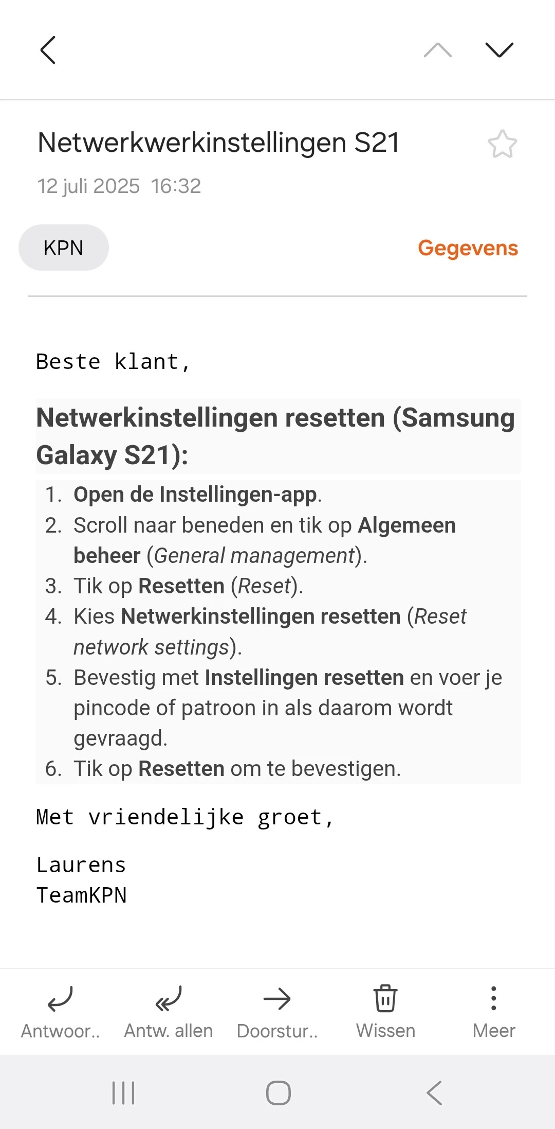 Als ik denk aan de belafspraak van zaterdag en ik de mobiele netwerken mocht resetten wat niet helpt dan vraag ik mij af of een tweede belafspraak wel zo zinvol is. Zou het niet beter zijn als ik naar een KPN winkel ga van het weekend en dan niet naar de Herestraat in Groningen maar een andere KPN winkel? Als ik dan in de winkel weer problemen ervaar met de zendmasten en servers zoals met de Emailapp van Samsung met Outlook, Gmail, webmail van KPN, Woordfeud, Tado, WiZ enzovoorts dan geeft dat beter aan de knelproblemen dan bellen en te horen krijgen dat er niks aan de hand is. Dan wordt ik blij gemaakt met een dooie mus.  Zelfs deze server van het Forum van KPN doet raar ook al gebruik ik wifi. Alleen als ik inlog zie ik deze laatste reactie. Uitgelogd niet op het Forum van KPN. Merkwaardig en vreemd. Ondertussen heb ik weer slecht bereik met wifi samen.