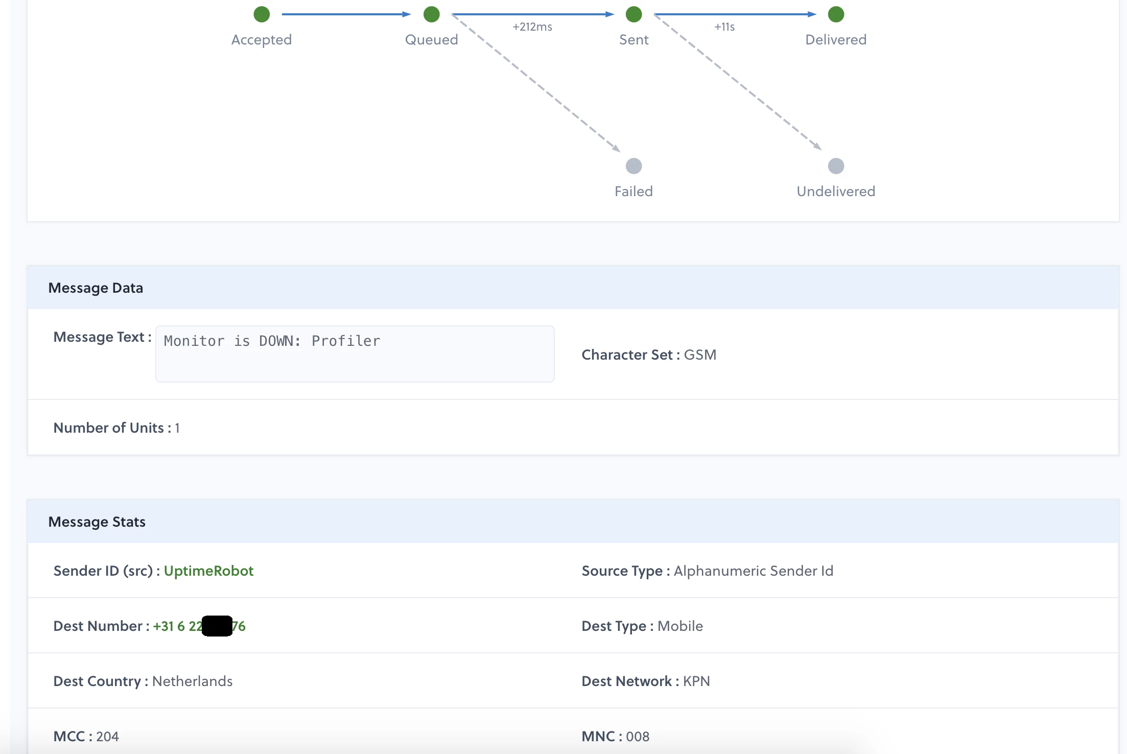 Wij hebben recent een betaald abonnement aangeschaft van www.UptimeRobot.com, om de uptime van onze servers te monitoren. So far so good. Naast e-mail notificaties hebben wij ons ook met drie Nederlandse mobiele nummers geabonneerd op SMS notificaties.